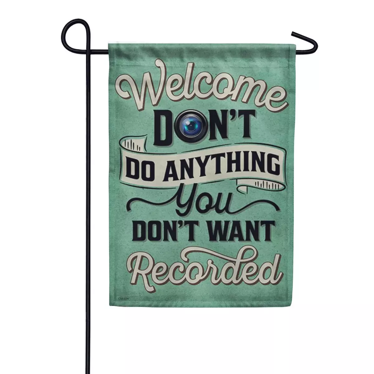 Welcome visitors to your home with this playful yet practical garden flag featuring the message "Welcome DON'T DO ANYTHING You DON'T WANT Recorded." The charming teal background and mixed typography create an eye-catching design that adds personality to your entryway. This delightful flag serves as both a decorative accent and a friendly reminder about home security.
