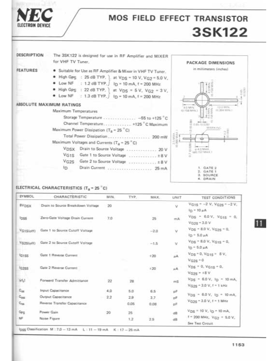 1X 3SK122 NEC Dual Gate N Channel MOSFET VHF TV Tuner RF Amplifier Mixer
