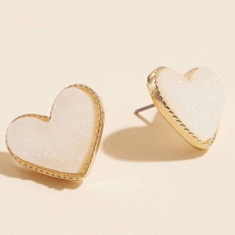 Heart Druzy Stone Stud Earrings - Ivory Sparkle Statement Jewelry