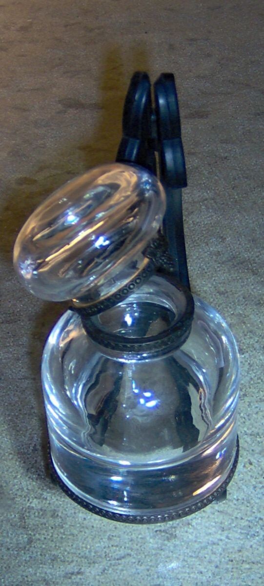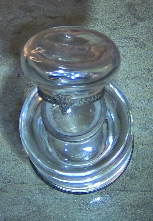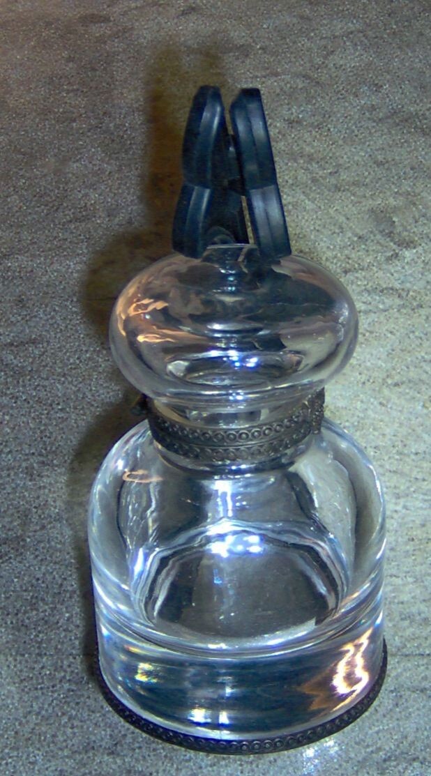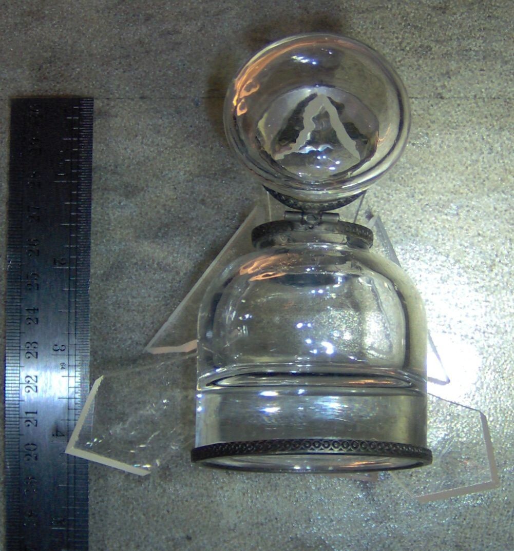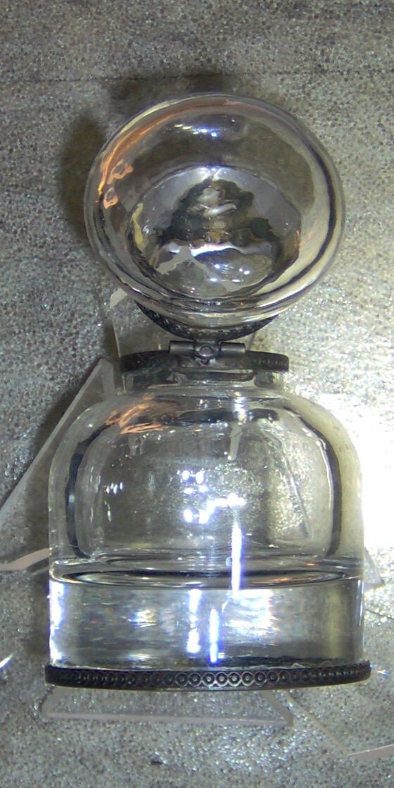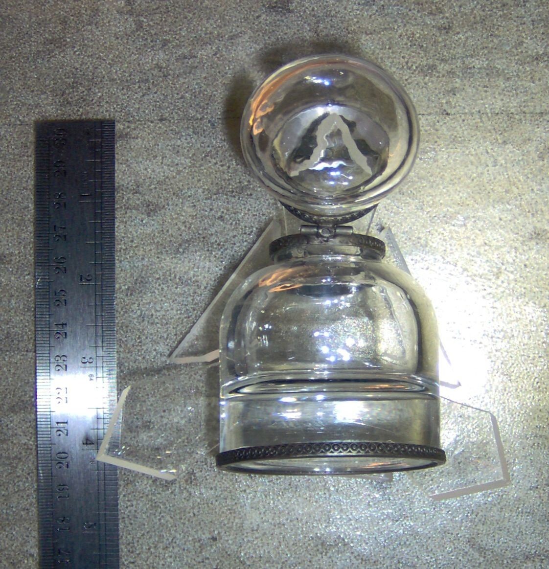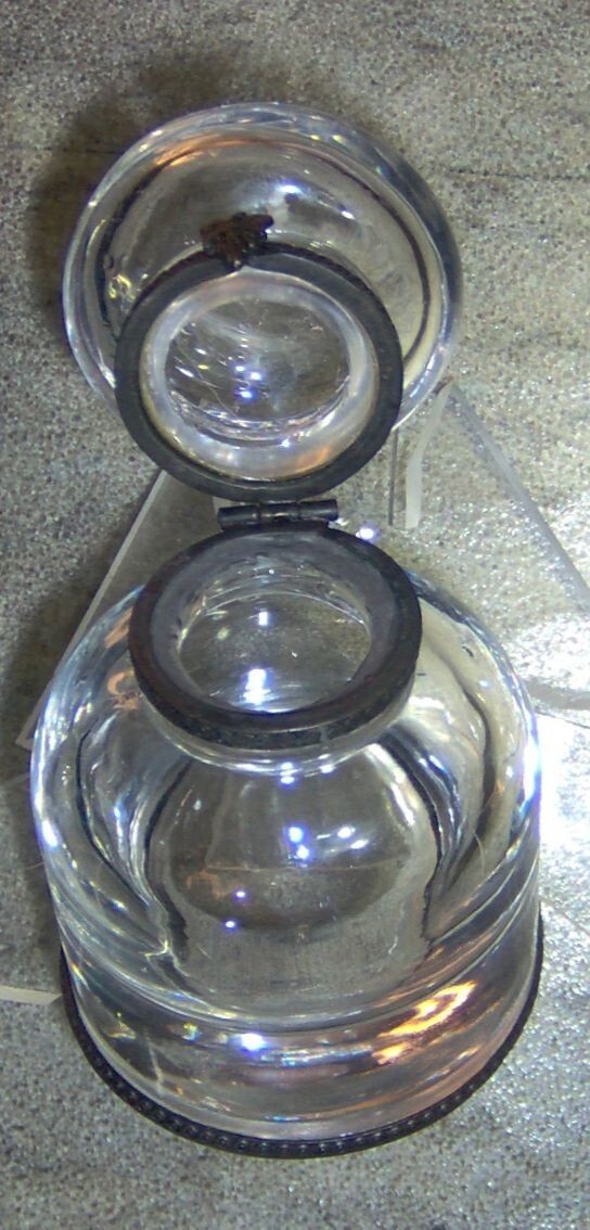 (1) VINTAGE USED CLEAR GLASS INK WELL WITH HINGED METAL DOME LID. NOTE, THIS ITEM appears TO HAVE BEEN (successfully) REPAIRED AROUND THE OVERLAY RIM WITH AN EPOXY, BEAUTIFUL CLEAR, THICK, AND HEAVY (10 ounce) GLASS INK WELL STANDS 3 1/2" tall X 2 1/4" wide AT THE BASE. 10 ounce WEIGHT DUE TO THE THICK AND HEAVY CLEAR GLASS CONSTRUCTION. THE FLIP DOME LID OPENS TO ALLOW ACCESS TO THE INTERIOR CONTENTS. COMMONLY USED WITH DIP PENS AND QUILLS, THIS ITEM PROVIDES THE USER A RESERVOIR OF INK ON THEIR DESK. FEATURES METAL OVERLAY RIM ON LID, INKWELL TOP AND BASE. THE MANUFCTURER AND AGE OF THIS ITEM ARE UNKNOWN, I WILL GUESS A MINIMUM 40 YEARS OLD OR MORE. YOU WILL RECEIVE ONE (1) VINTAGE USED CLEAR GLASS INK WELL, AS PICTURED, SHIPPED BY USPS....
