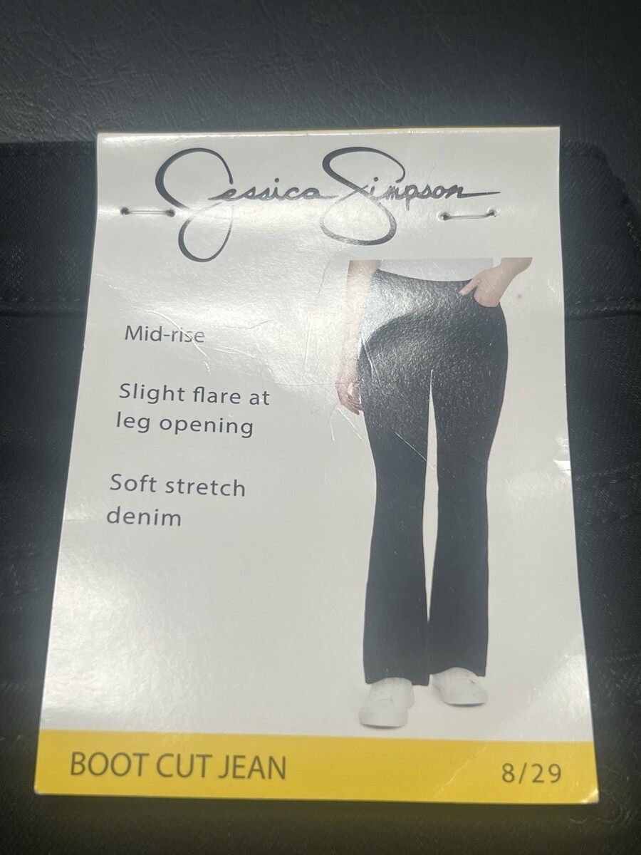 The product is a pair of Jessica Simpson bootcut mid-rise jeans in size 8/29 for women. The jeans come in a classic black color, making them versatile for various outfits. With a flattering bootcut style, these jeans are designed to be both fashionable and comfortable for everyday wear. Perfect for any wardrobe, these Jessica Simpson jeans are a stylish choice for women looking for a classic and timeless addition to their collection.