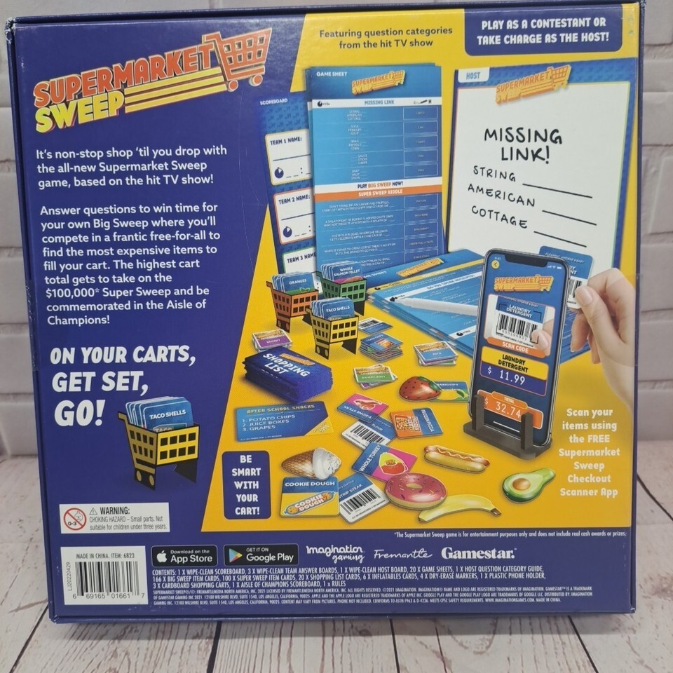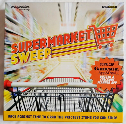 The "SUPERMARKET SWEEP" board game by Imagination Gaming is a race against time game where players compete to collect items in a supermarket setting. Designed for 3 or more players aged 12 and up, the game challenges players to think quickly and strategically. With a theme of movie TV, this BRAND NEW game offers fun for both boys and girls, and is manufactured in China in 2021.