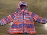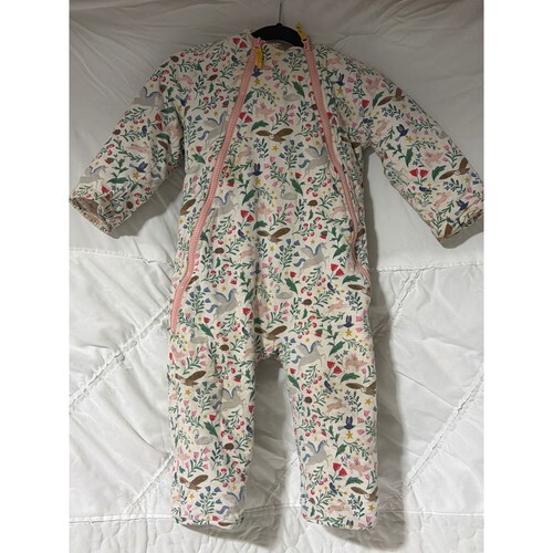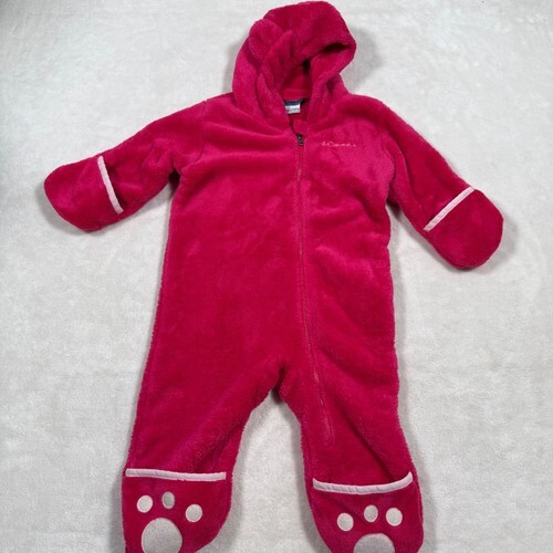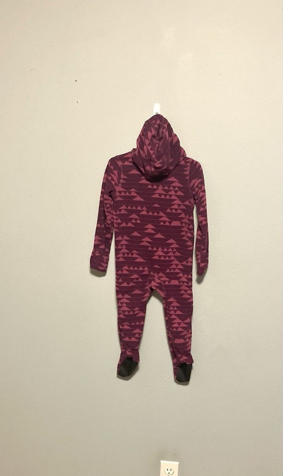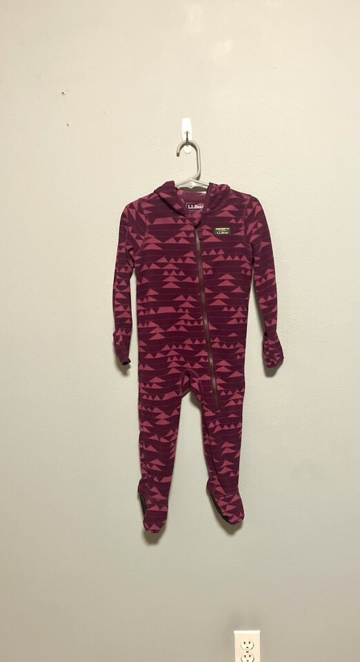 This is a soft lightweight fleece bunting from L.L. Bean. Full zip, footed with fold-over mitts and a hood. Fuchsia with a purple mountain pattern and smooth black soles. In Very Good Condition with no fading, damages or other signs of wear.