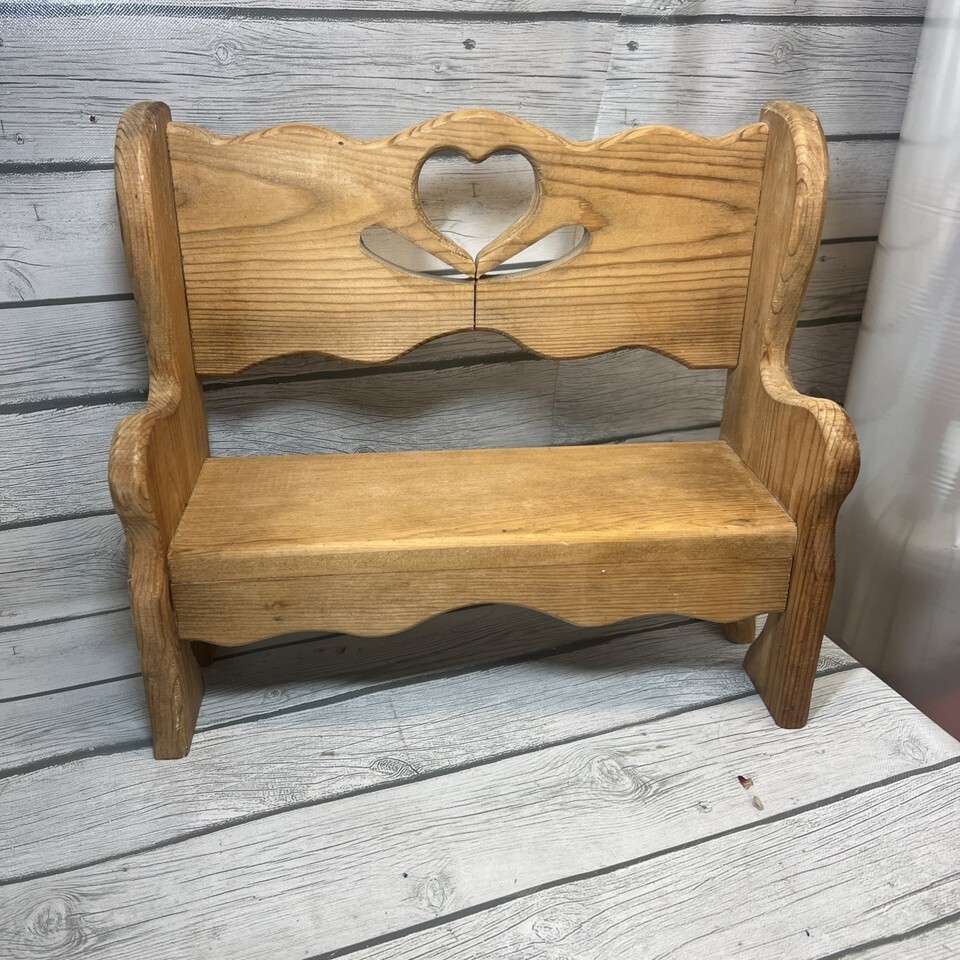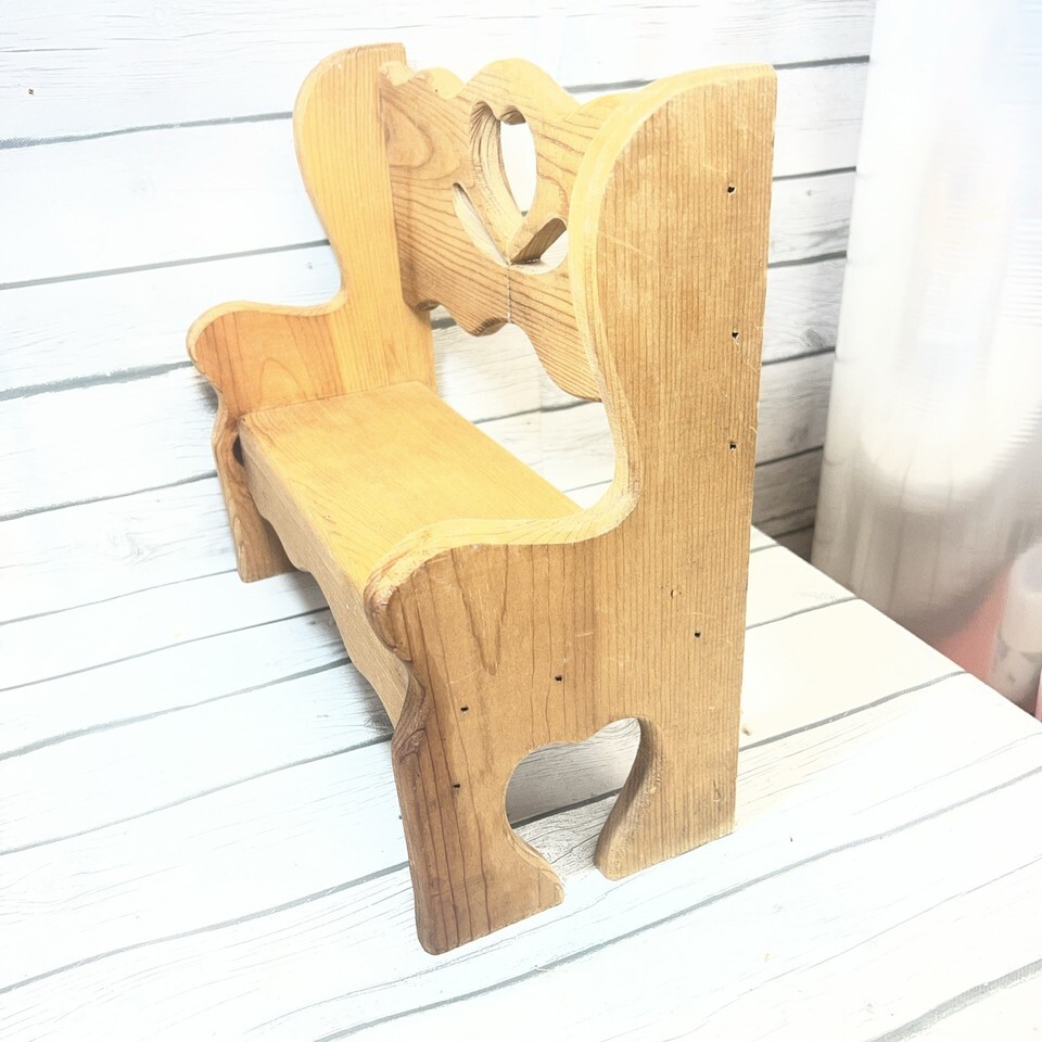 This vintage hand-made solid wood heart country farm small brown bench is perfect for kids and adds a charming touch to any home decor with its unique style and theme of hearts. The bench is crafted from wood and features a rustic brown color, showcasing a country aesthetic. With a compact size of 15 inches in height and 16 inches in length, and a width of 6.5 inches, it fits well in small spaces and provides a cozy seating option for children or additional seating in a living room or bedroom.