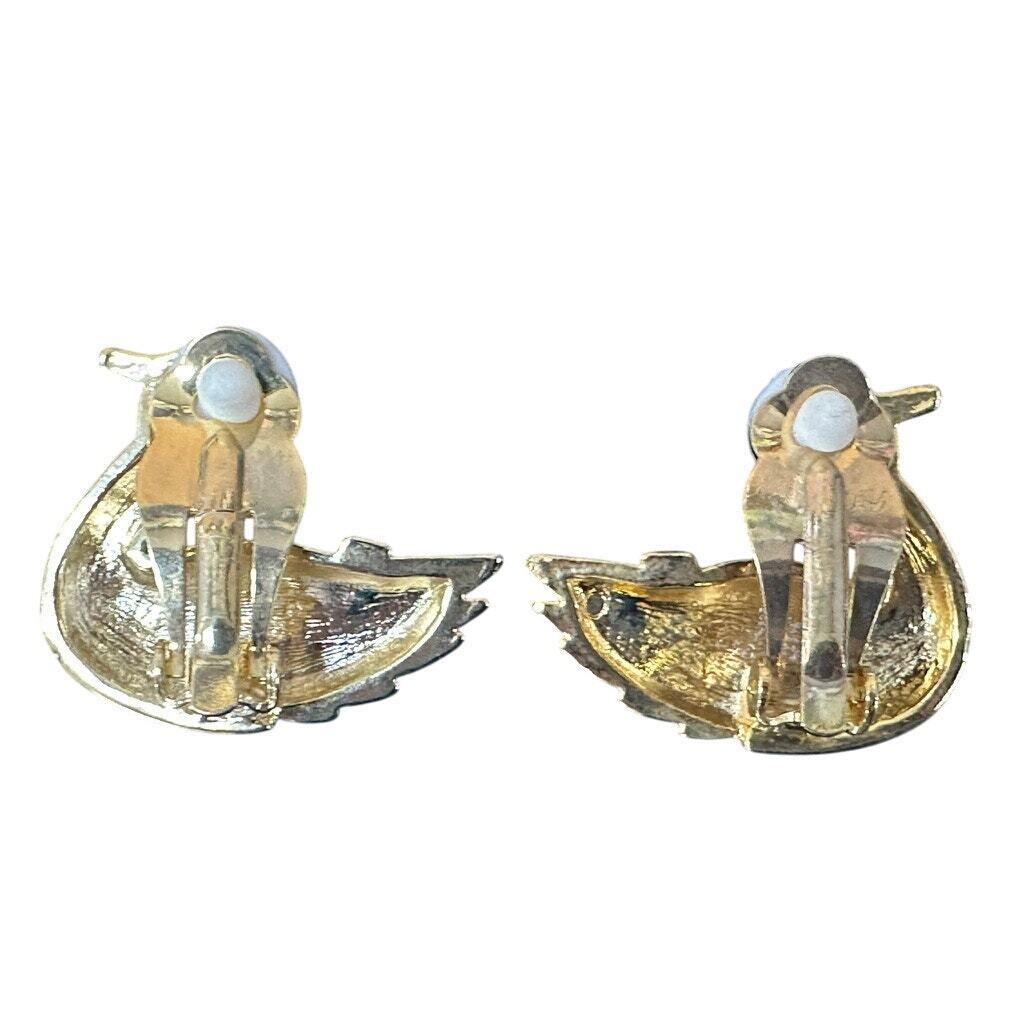 Vtg Earrings Mallard Duck Bird Jadeite Rhinestones Clip Back 1 3/8"