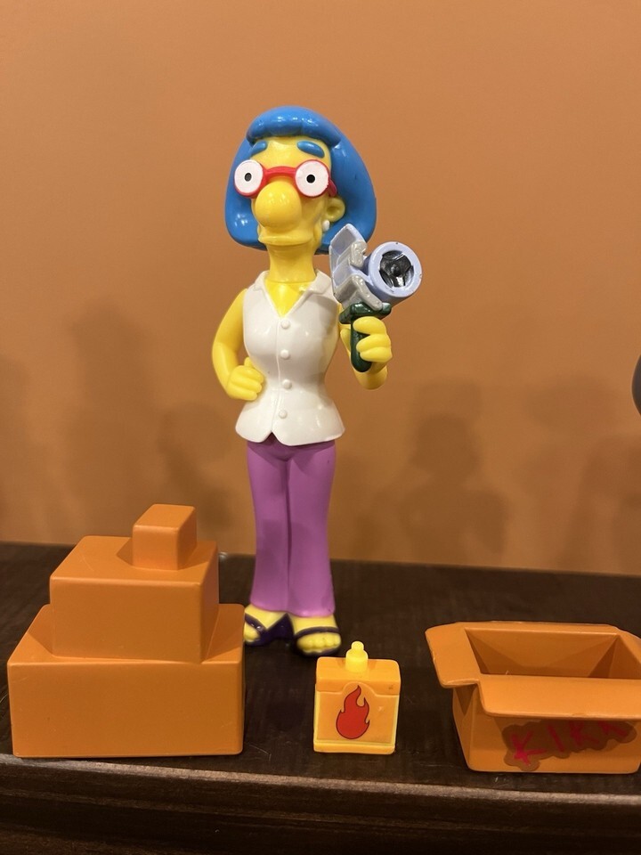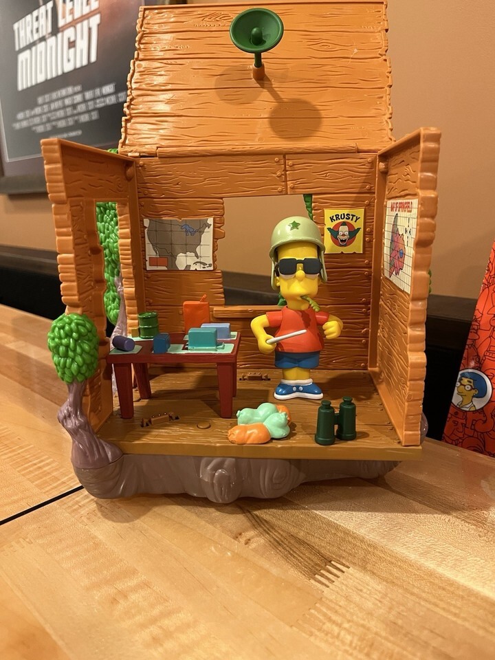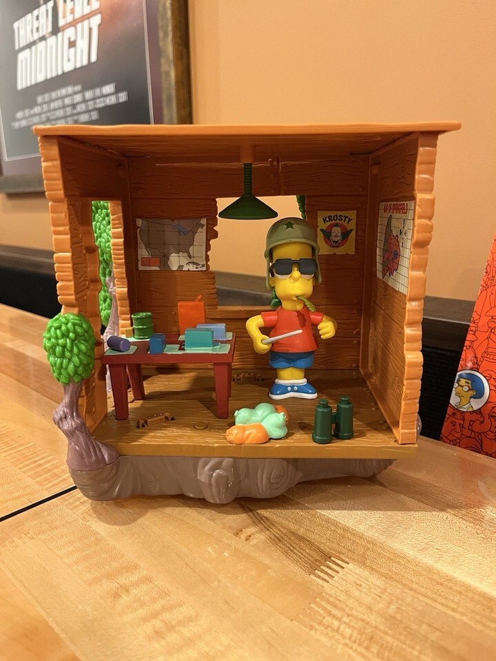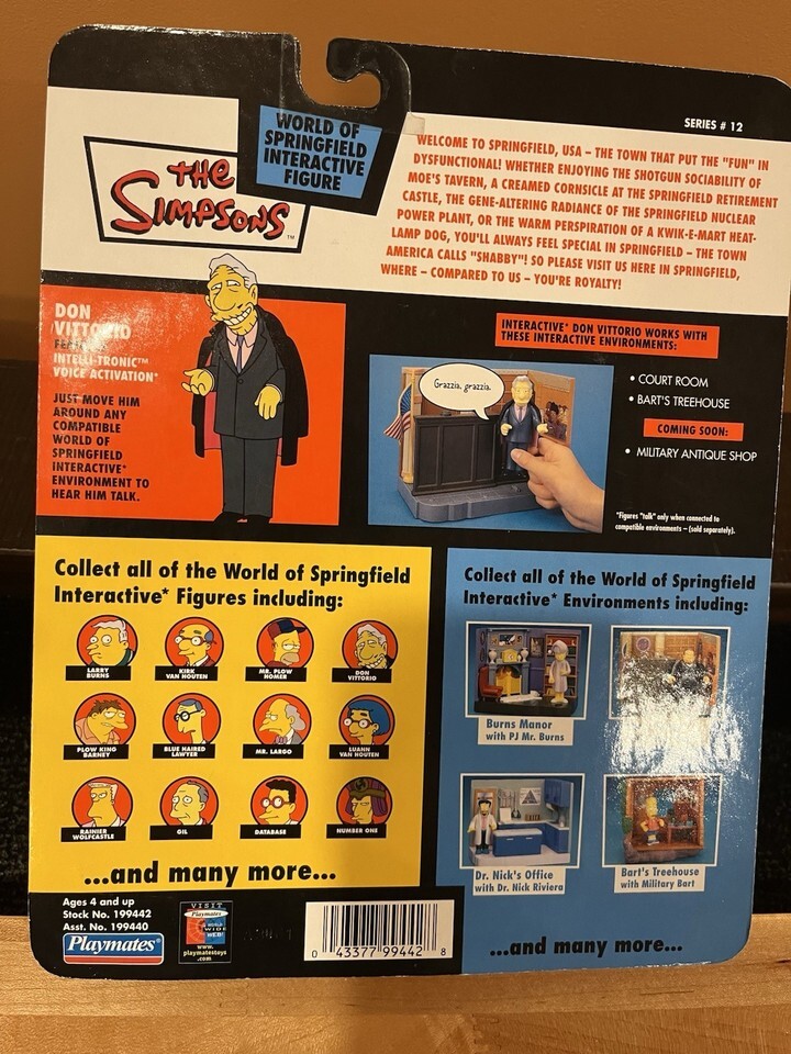 The Simpsons world of Springfield 2003 wave 12 complete set with interactive environment of Bart?s treehouse. The following figures are loose with all accessories that were included in the original package database Luanne Van Houten, Mr. plow Homer, and number one the following two figures are in their original packaging as shown. Mr. Largo and Don Vittorio Bart?s treehouse comes complete with Bart and all original accessories that were included with the original package.