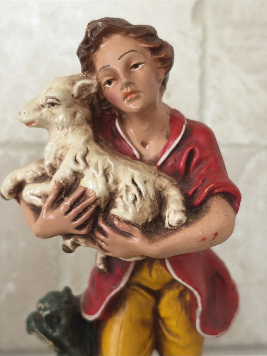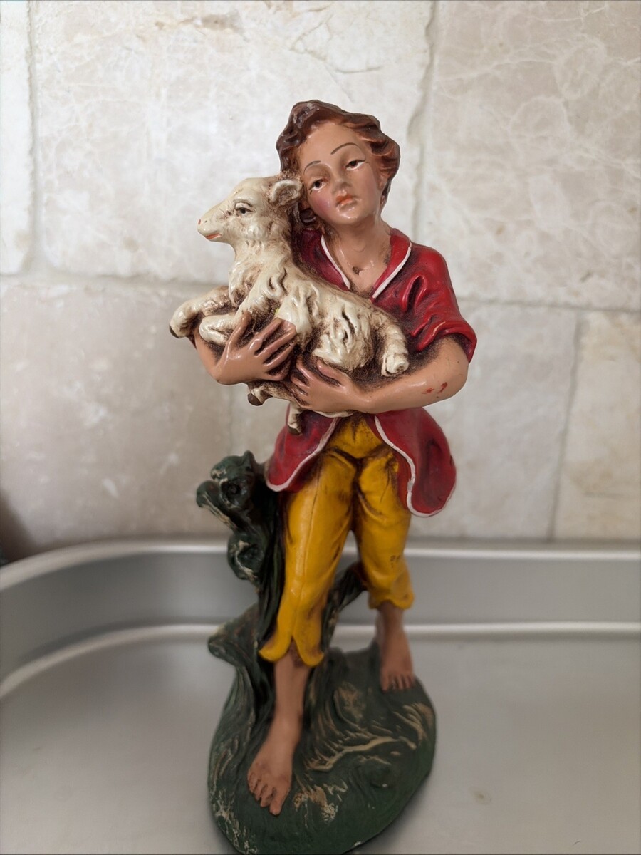 VINTAGE SHEPHERD BOY - ITALY NATIVITY FIGURINE HOLDING LAMB On Arms 8โ READ