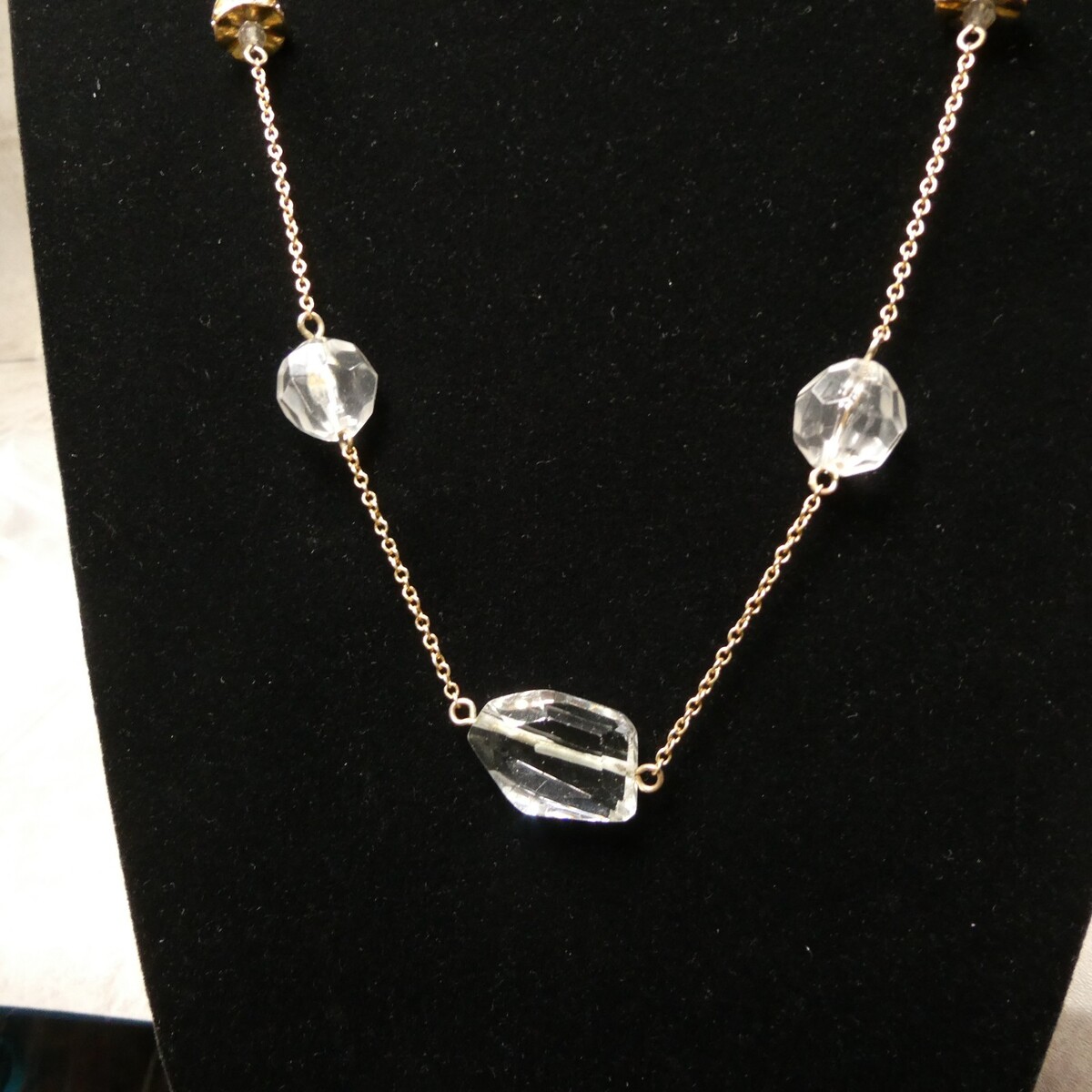 For Sale: J Crew Rhinestone Clear Lucite Beaded 34" Single Strand Gold-Toned Chain Necklace with the following features: