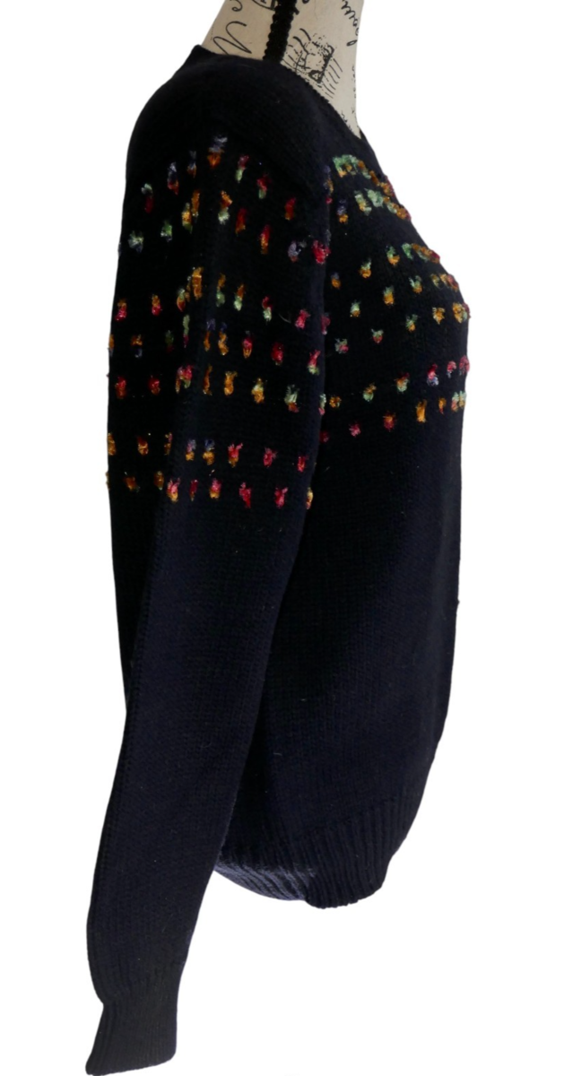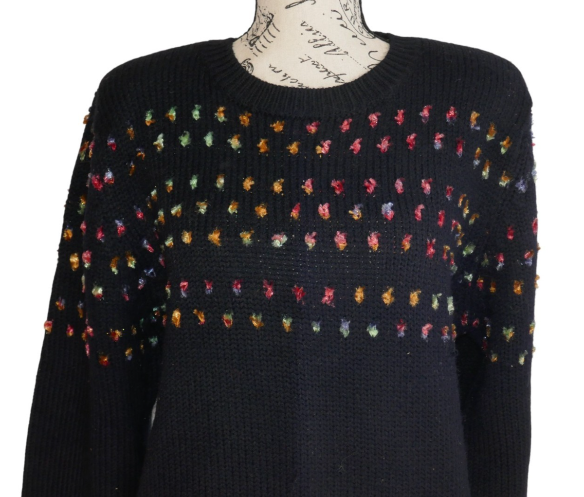The Christina Grant Vintage Knit Sweater is a stylish and lightweight addition to any wardrobe. This measures approx. 21" from pit to pit and 25" from shoulder to bottom hem with 26" long sleeves. Made from a blend of nylon and acrylic, this tight-knit sweater features a solid black color with colorful design on the front. Perfect for casual, party, or travel occasions, this pullover sweater is adorned with shoulder pads and is breathable, making it ideal for the winter, fall, or spring seasons. Its retro 80s theme adds a touch of nostalgia to your outfit, while the hand wash only care instruction ensures longevity.