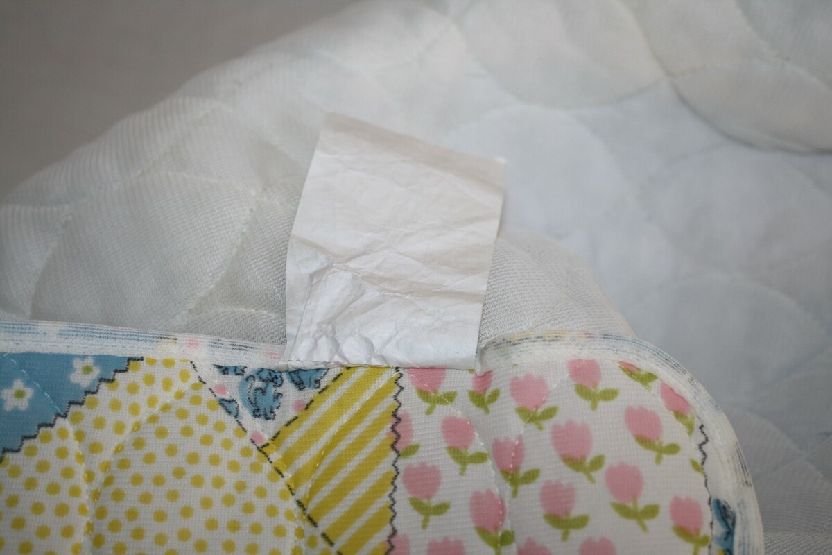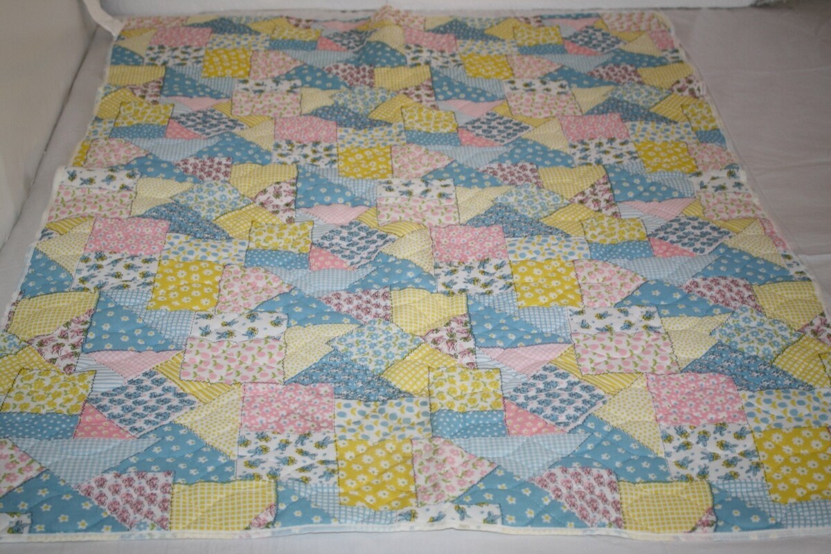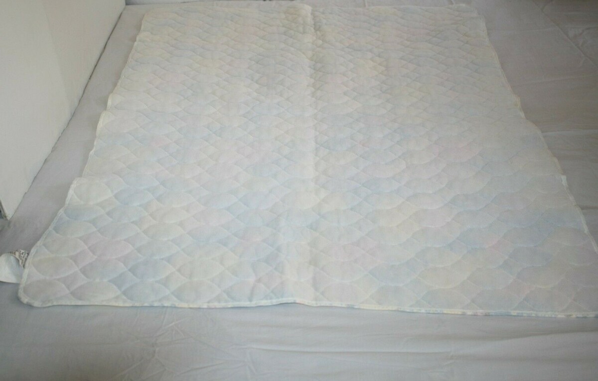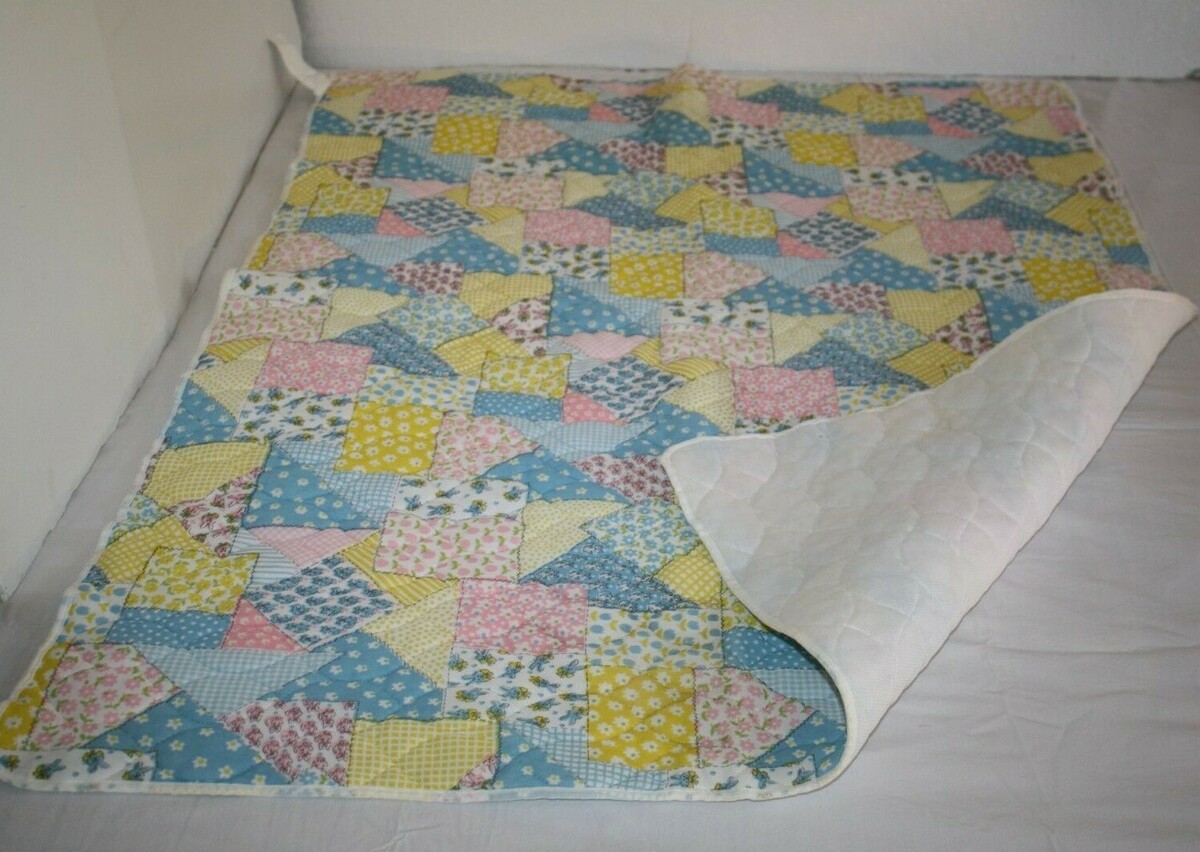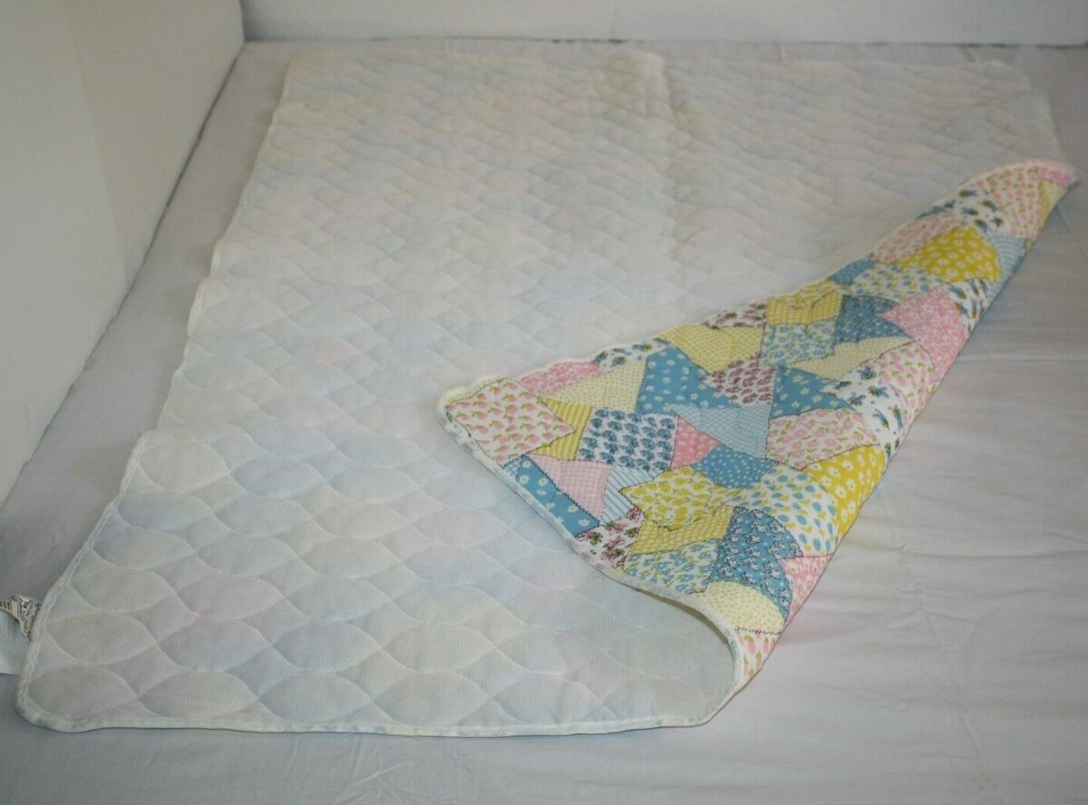 Condition: Blanket is New and Never used, but has been Machine Washed/Hung to Dry. Vintage 60's or 70's baby blanket. All one solid piece material that looks like patchwork quilt. Fabric topside is silky like nylon/polyester material. Machine Quilted. Blanket is New, but has been washed. Some stitching is coming out around edges, Few picks in material backing. Smoke-free environment