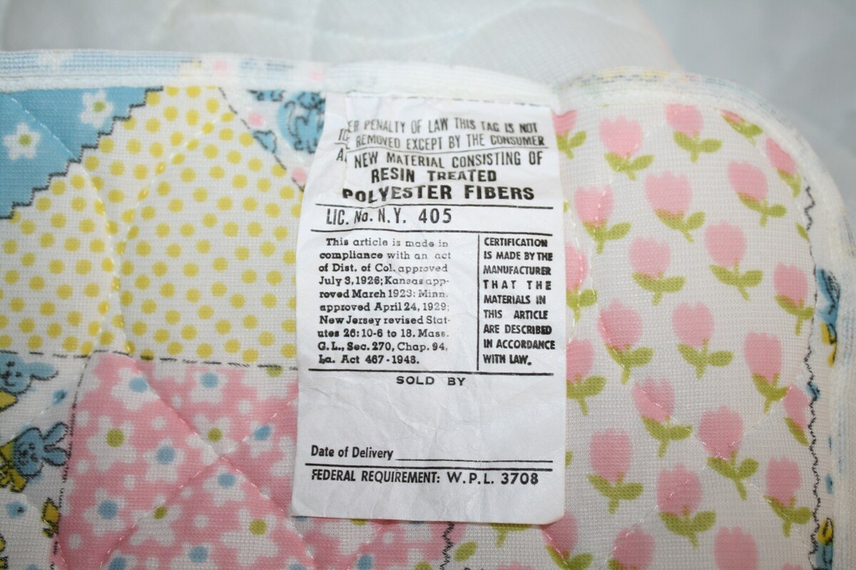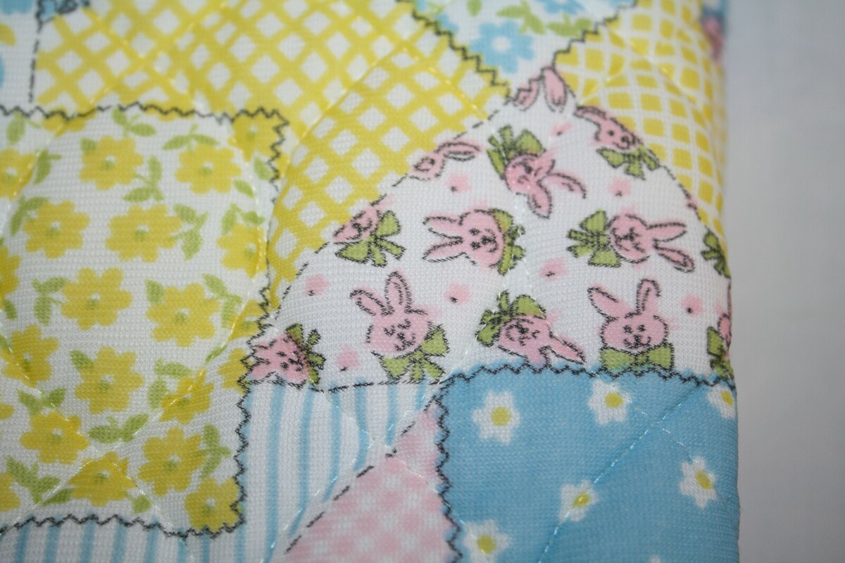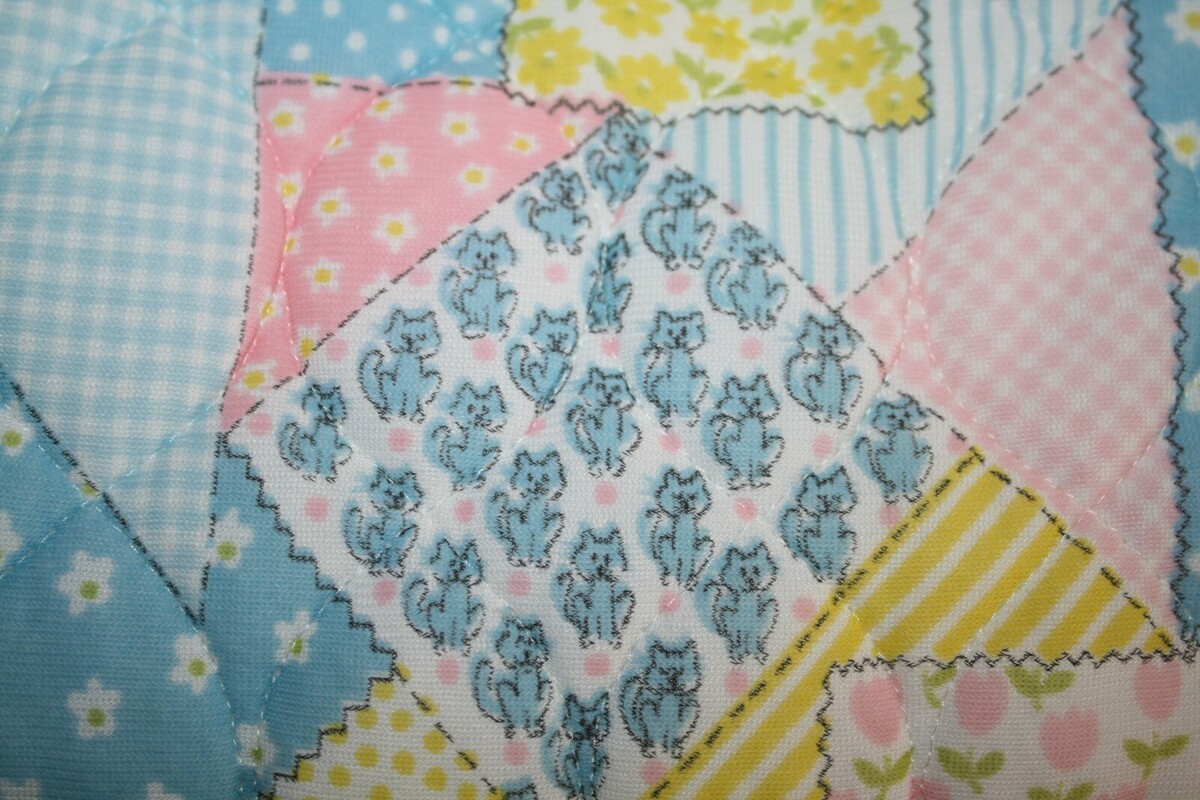 Patchwork Quilted Pattern Pastel Baby Blanket Bunny Cats Flowers Vtg 60s 70s