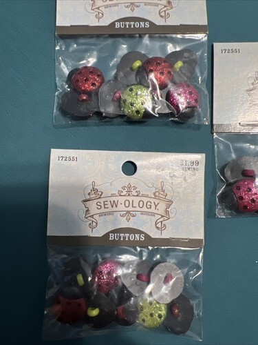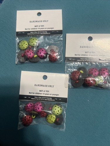 (3) new packs of sewology ladybug buttons. 9 buttons in each pack. Colors: red, pink, green