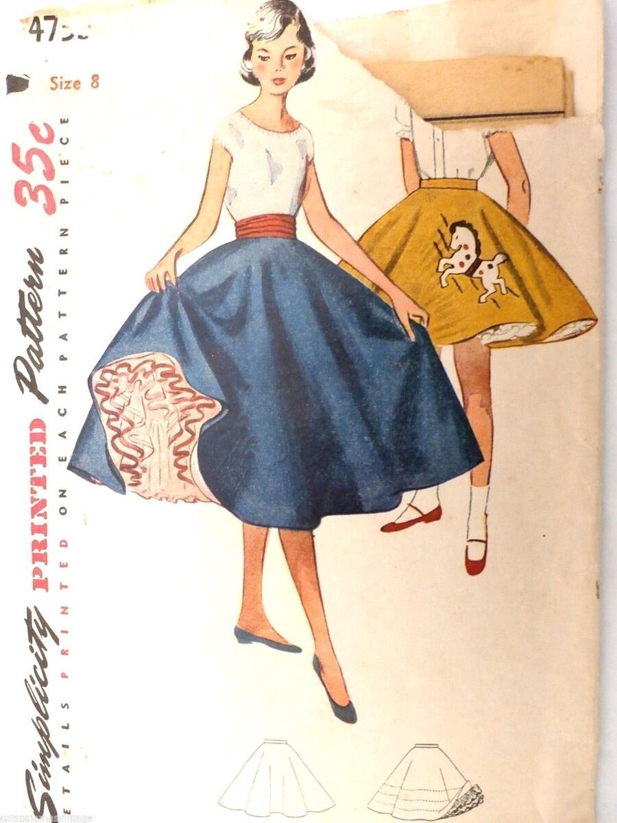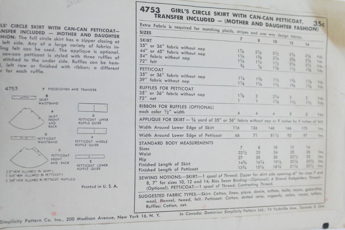 Pattern is for a girl?s circle skirt with can-can petticoat (?mother and daughter fashion?).