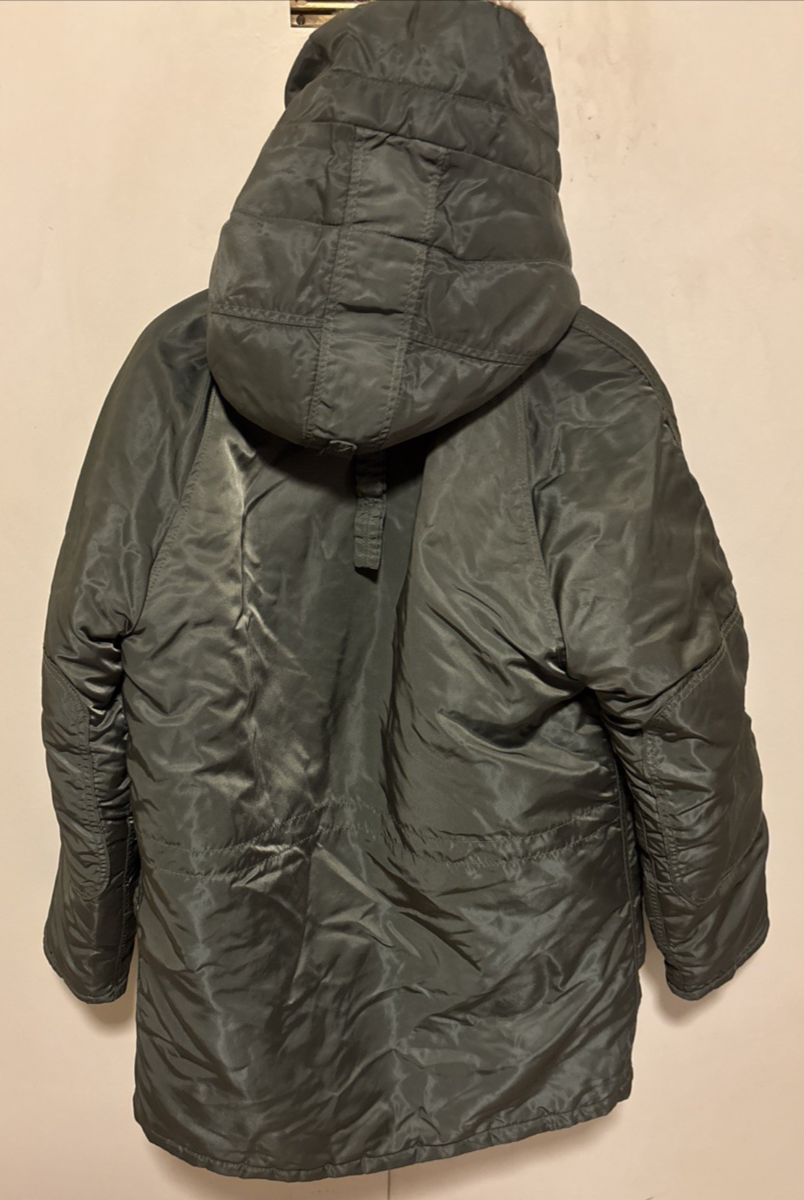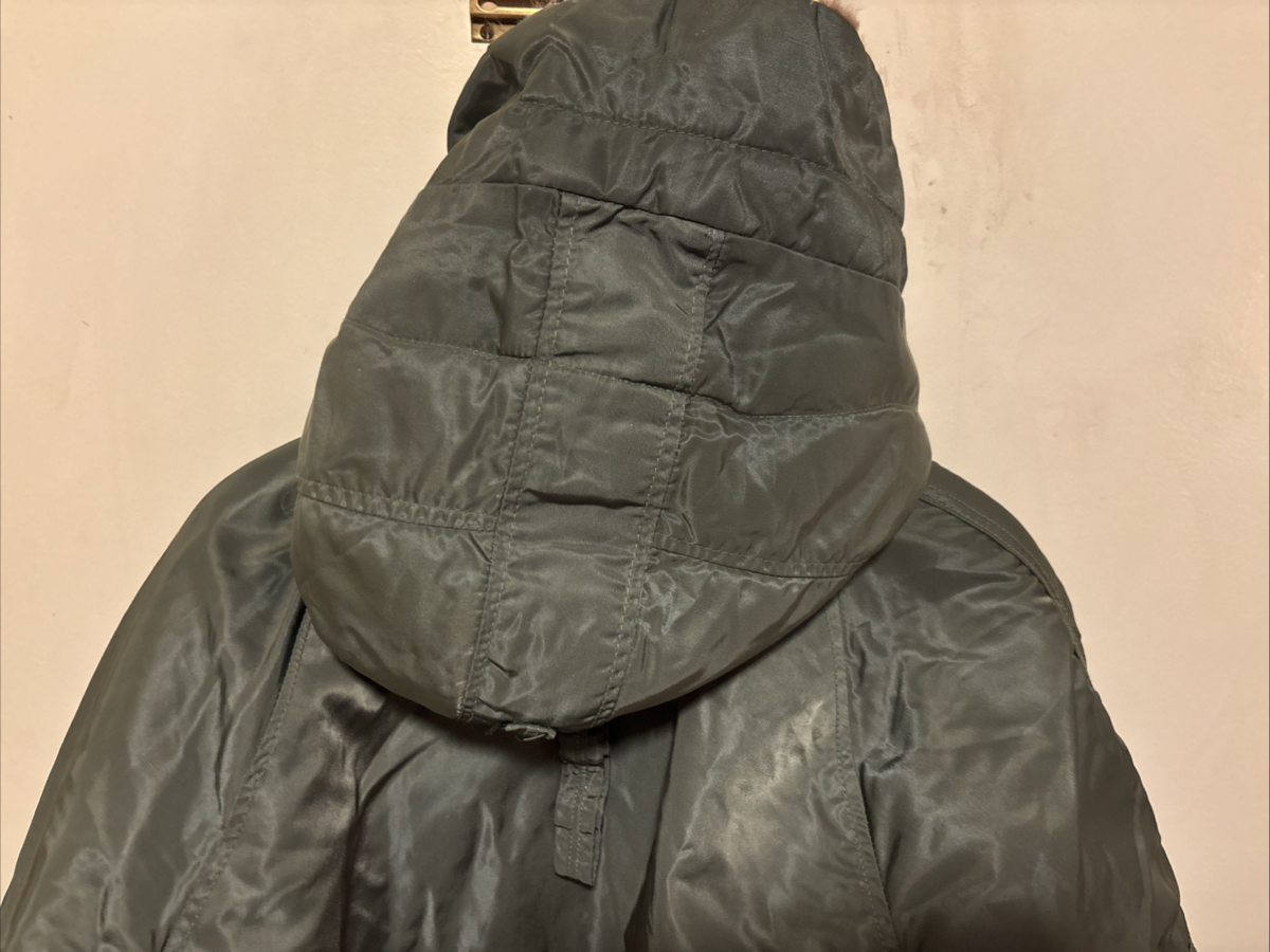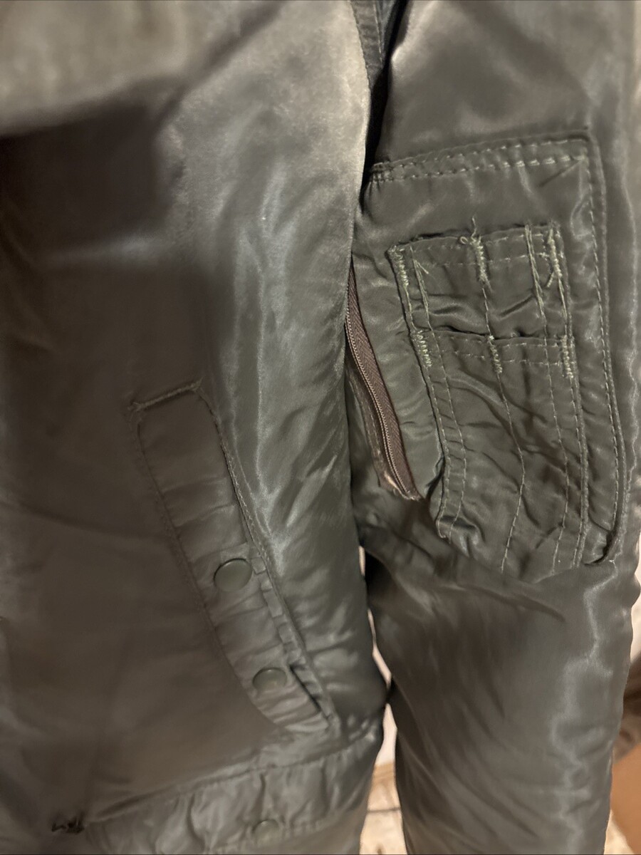 The Vintage Spiewak Sons Golden Fleece Military N-38 Parka Jacket is a classic and durable outerwear piece made in the USA. This unisex jacket features a green nylon outer shell with a cozy fleece lining, perfect for cold weather. The bomber and tactical style of the jacket, along with its quilted design and Americana theme, make it a timeless piece for outdoor enthusiasts and military enthusiasts alike. The jacket's size is large, making it a versatile option for a wide range of wearers. Length 30 inches armpit to armpit 24 inches arm length from neck 27 inches. fur removed