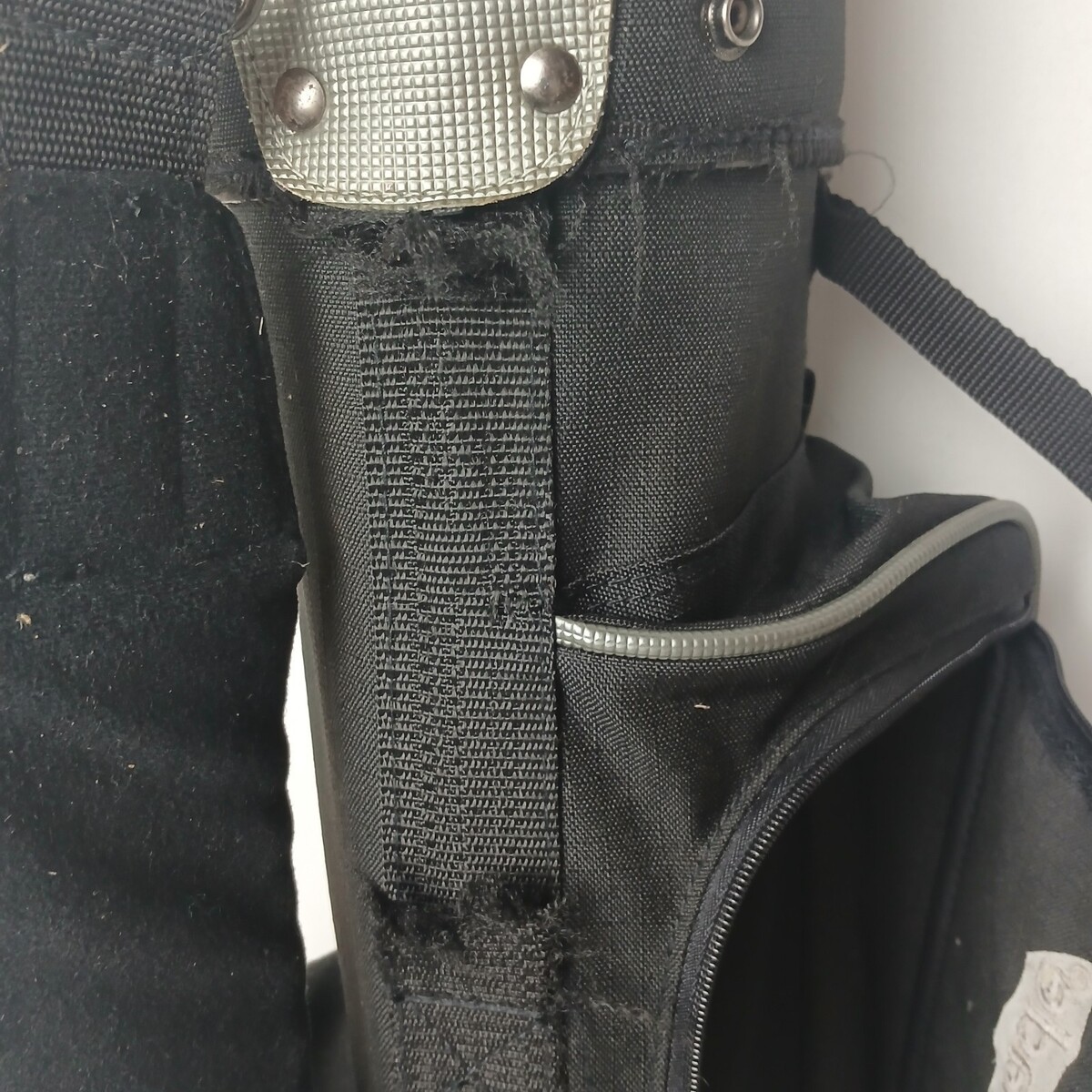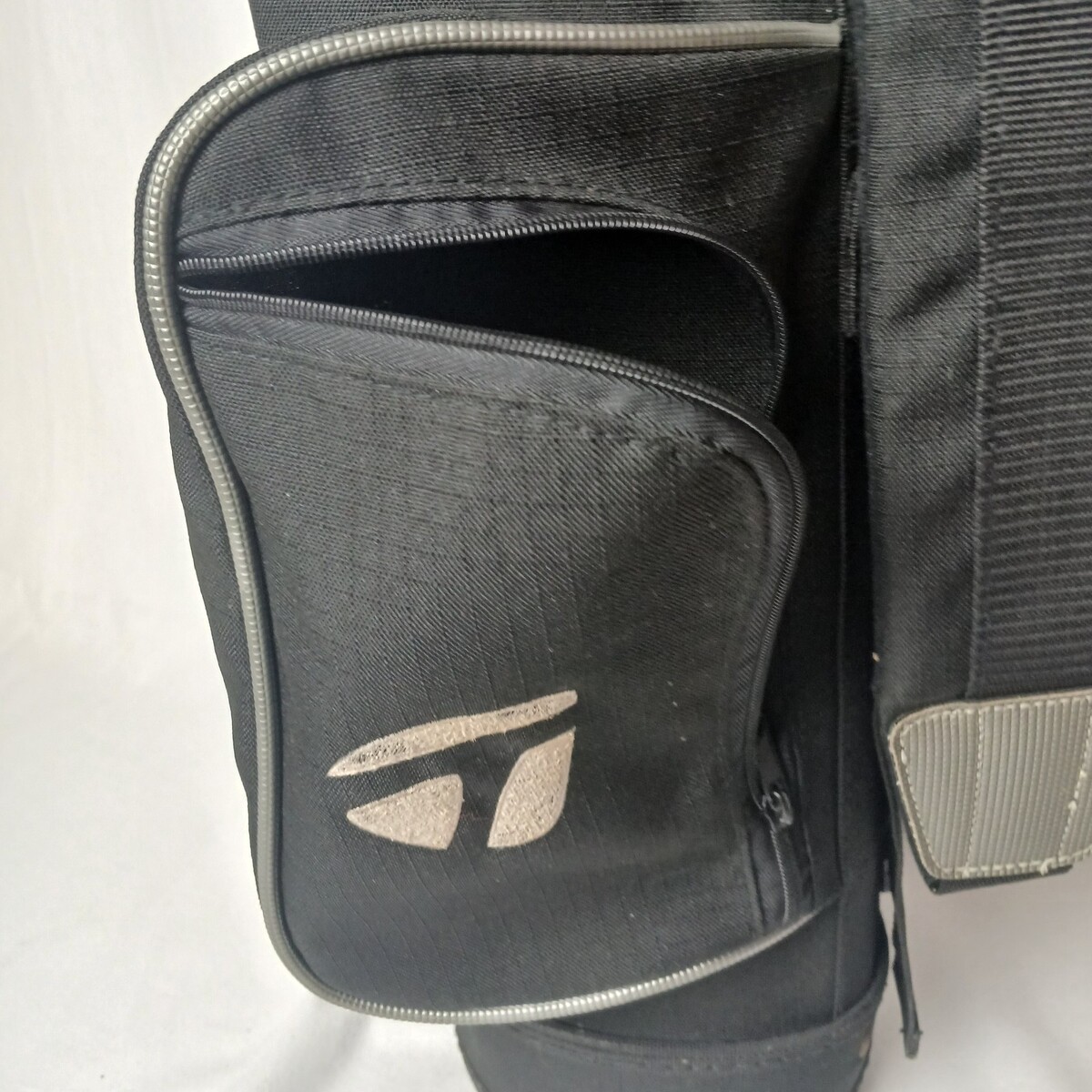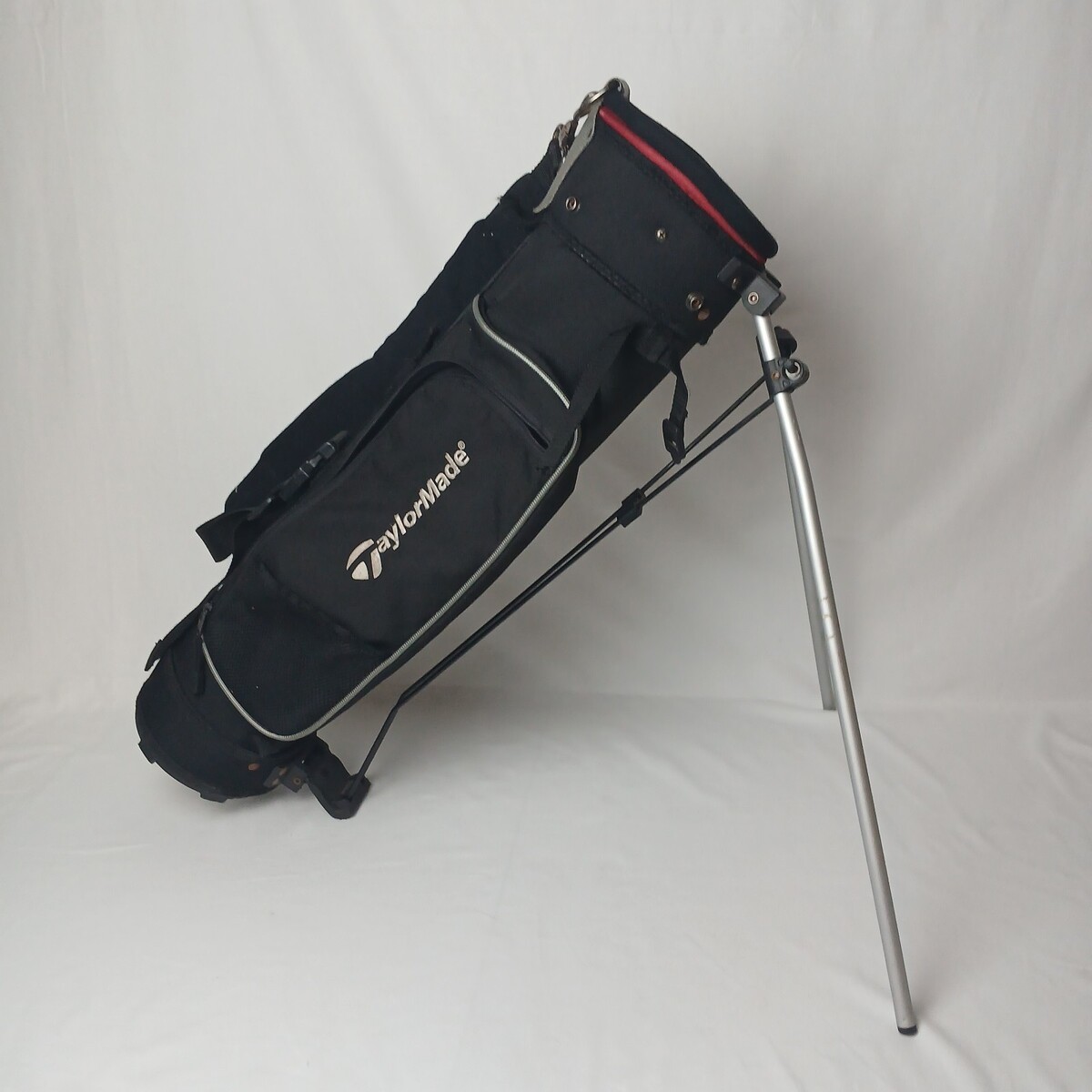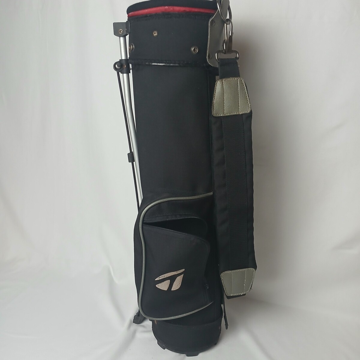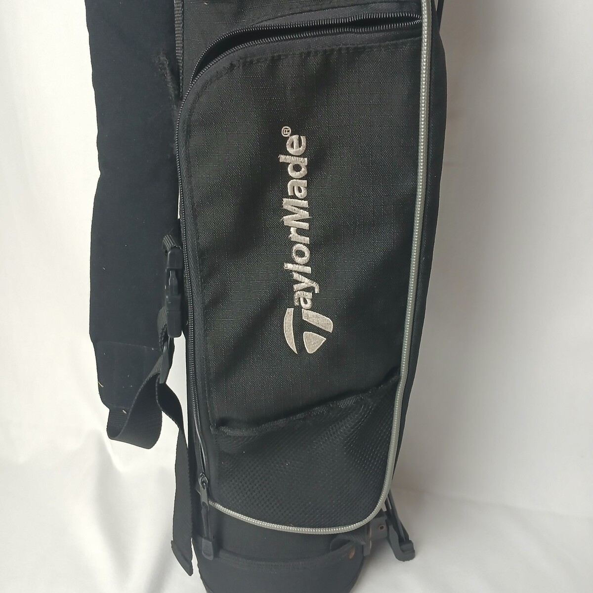 This listing if for a Taylormade Youth Golf bag. This is a stand bag. There is no carry handle, but thereis a shoulder strap. The carry handle appears to have been cut off. It features a 2 chamber divider. There are 2 zipper pouches and 1 open mesh pouch. The bag is gently used and has been cleaned. All of the zippers work. The pouches are in good shape.