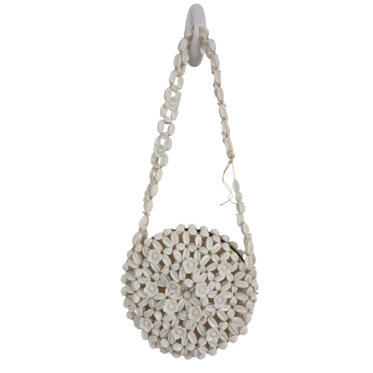 It?s a plastic bead purse with a fabric liner. The white beads, in various flower and barrel shapes with four ?fins? each, close with a metal zipper. The strap matches the beaded pattern and is longer for shoulder wear, though the bag sits high under the arm. The single compartment has a small slip pocket. The bag measures 6? in diameter and 1-1/4? across the bottom, with an 8? handle drop.