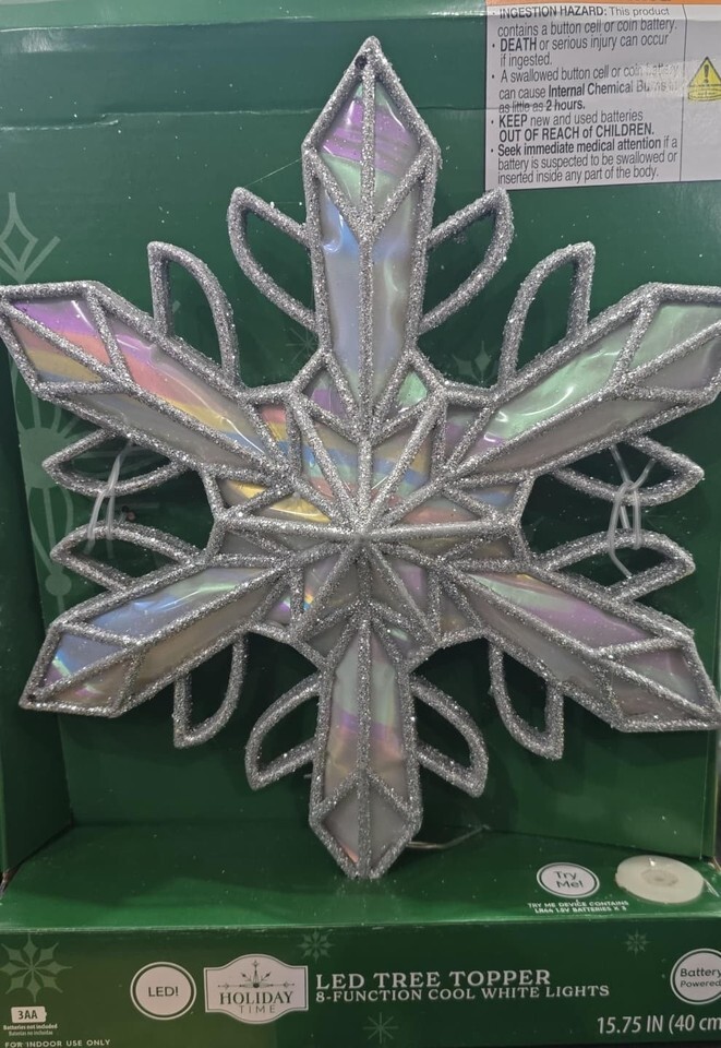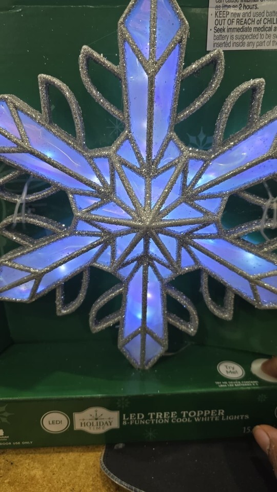 Top off your tree with icy brilliance using the Holiday Time Battery-Operated LED Snowflake Christmas Tree Topper. This elegant topper features a detailed snowflake design framed in glittery silver and illuminated by 60 cool white LED lights for a crisp, wintry glow. With eight different lighting functions and a built-in timer (6 hours on/18 hours off), you can effortlessly set the perfect mood throughout the season. At 15.75 inches tall, it's ideal for medium to large trees and easily secures in place with a sturdy base. Add a frosty, festive finishing touch to your Christmas display with the Holiday Time Battery-Operated LED Snowflake Christmas Tree Topper.
