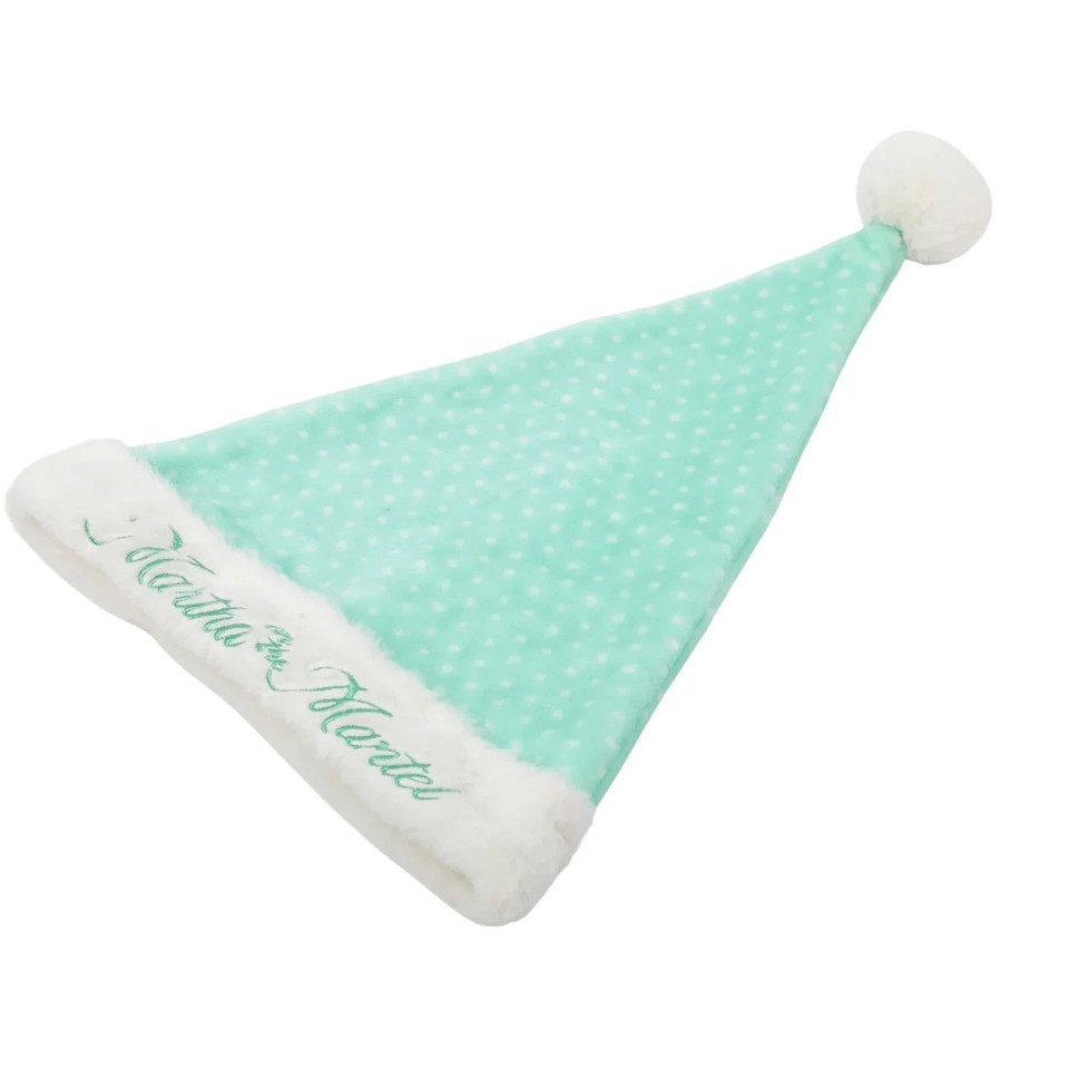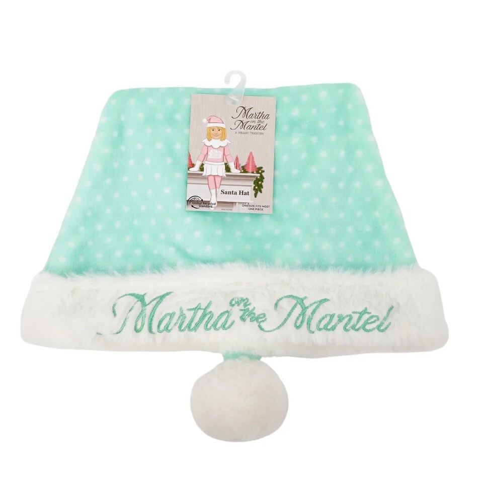 Add a festive touch to your holiday season with a Martha on the Mantel Santa Hat. This adorable hat is designed with soft, plush, beautiful fabric and features Martha?s signature colors, making them the perfect accessory for all your Christmas celebrations. Great for family photos, parties, or gifts. The Martha on the Mantel Santa Hat is a must-have for spreading Christmas holiday cheer!