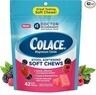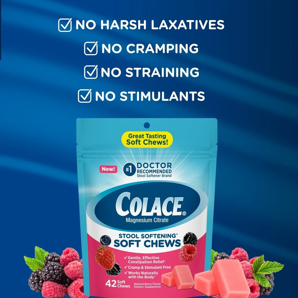 Colace, the 1 Doctor Recommended stool softener, now has soft chews. The new soft chews provide you with the same gentle constipation relief as the capsule now in a soft mixed berry chewable. Works naturally with the body, relieving discomfort from constipation by increasing water in the stool, softening it and making bowel movements more comfortable. No stimulants, no straining and no cramping with Colace mixed berry soft chews.