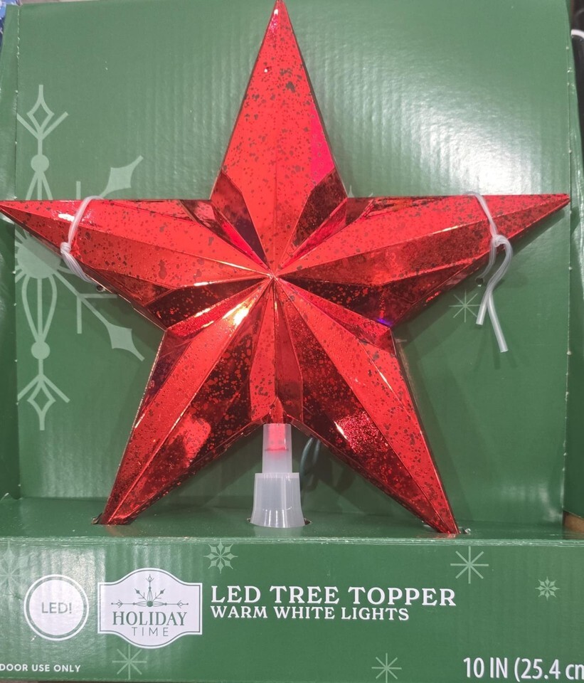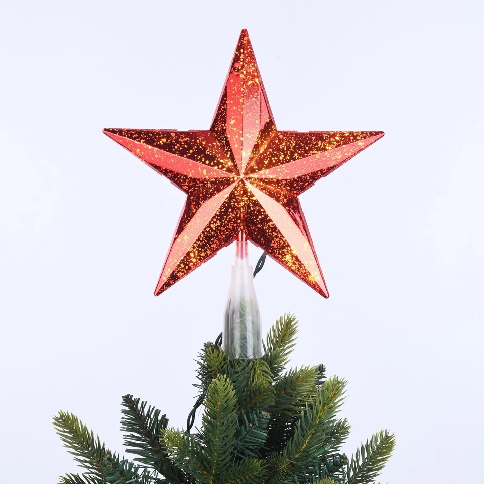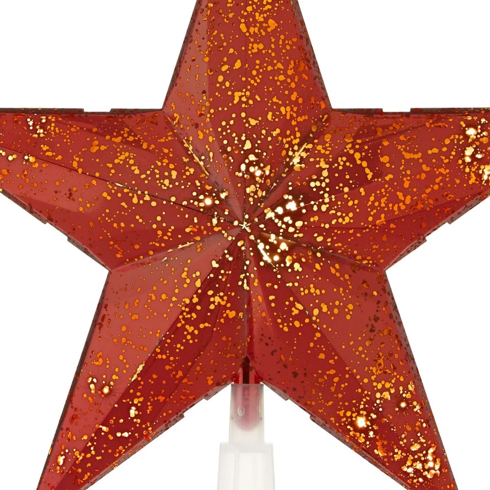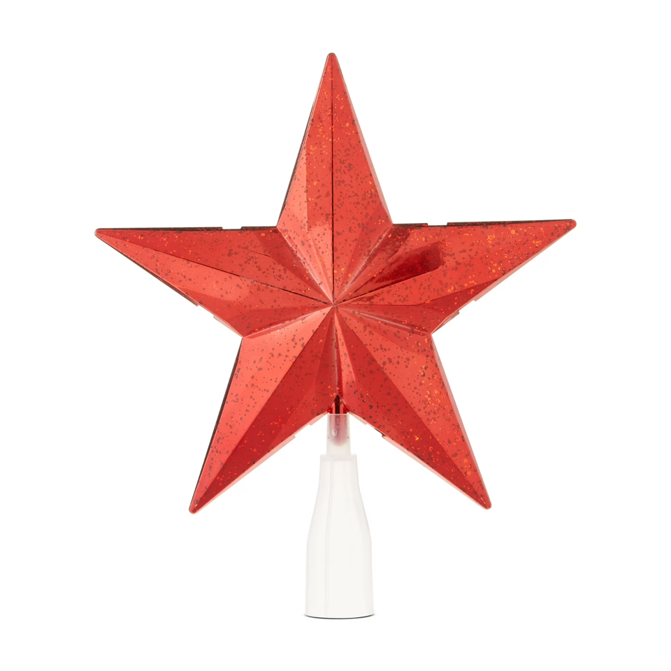 Brighten up your holiday decor with bold, classic style using the Holiday Time LED Speckled Star Christmas Tree Topper. This vibrant five-point star features a faceted 3D shape with a rich red finish and subtle speckled detailing for added depth and shine. Warm white LED lights glow from within, casting a soft, welcoming light across your tree. At 10 inches tall, it's the perfect size for medium trees and easily attaches with a sturdy base for secure placement. Add a festive pop of color to your tree with the Holiday Time LED Speckled Star Christmas Tree Topper.