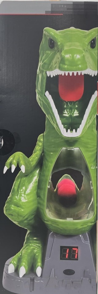 The goal is to shoot the foam balls into the T-Rex's mouth to hit the levered tongue and score points. Feed our buddy Rex and rack up the points. Load your Pop-Shot Ball Blaster and start feeding a prehistoric predator! Automatic Scoring Sound: Rex will roar for more when he's fed, so keep 'em coming!