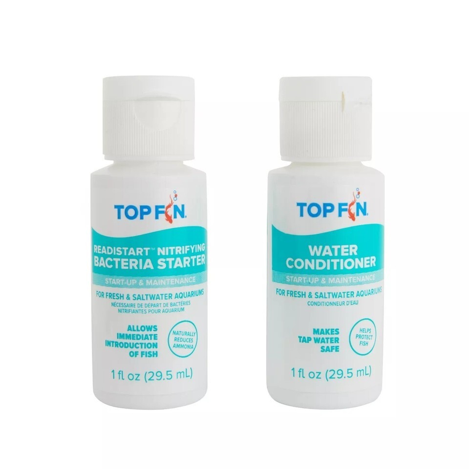 1. Add Top Fin Water Conditioner to tap water. Add 10 drops per gallon (1 tsp/5 ml per 10 gallons). Introduce fish to aquarium after water has been appropriately treated. 2. Add Top Fin ReadiStart Nitrifying Bacteria Starter to water treated with Top Fin Water Conditioner. Add 20 drops per gallon (1 tsp/5 ml per 5 gallons).