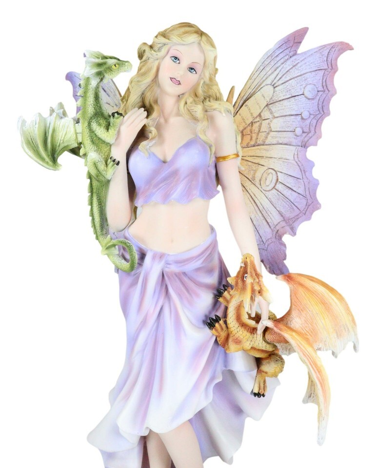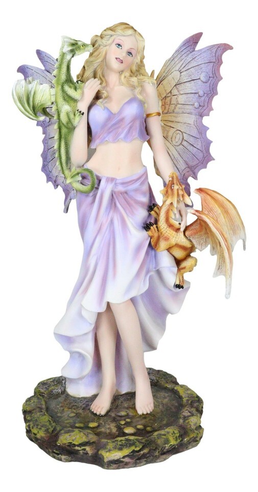 ? This lovely fairy is dressed in purple and her wings are hued with the same color. As the mother of dragons, she has two baby dragons on her left and right. She has a beautiful countenance and her blonde hair flows gracefully down her back.