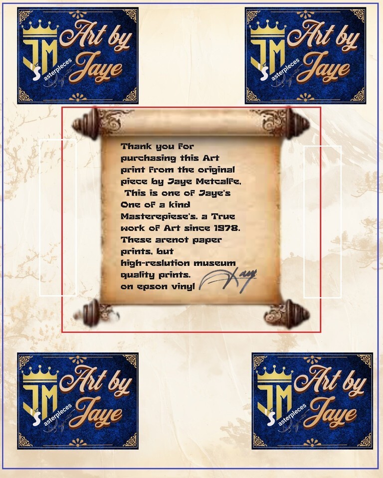 The product is a framed medium-sized poster titled "Donald Trump 2026 Border Patrol Texas Ranger and Friends 'No One Gets In Illegally'" by artist Jaye Metcalfe. The poster features a unique 3D design with an urban art style, depicting a scene where Donald Trump is depicted as a Texas Ranger. It is signed by the artist and comes with a Certificate of Authenticity. The piece is a limited edition one-of-a-kind print made on gloss paper, showcasing themes of Western art, politics, law enforcement, and history. The poster reflects a blend of various art styles including graffiti and pop art, making it a distinctive and collectible piece for art enthusiasts and fans of Trump's political persona.