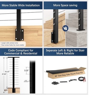 Space Efficiency Scenic Design: The 42" side mount post kit is meticulously crafted for deck side installation, maximizing space efficiency and creating an open visual environment. Welded side spacers provide remarkable contact stability, while four mounting holes ensure robust security, seamlessly adapting to a variety of architectural designs.