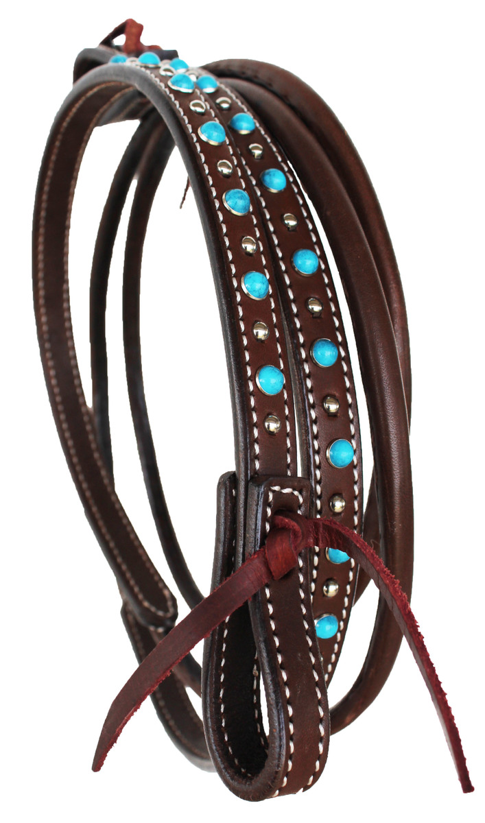 Challenger western 3/4" x 8' Rolled leather Barrel reins The ends of the reins are accented beautifully with turquoise stones and studs. Great for barrel racing, or trail riding. Complete with latigo tie bit ends, and durable Nickle plated snaps.