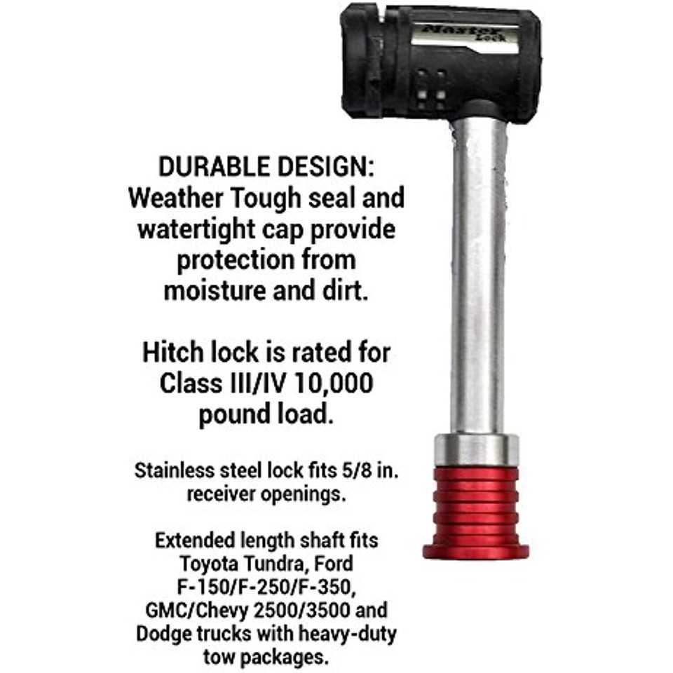 SPECIFICATIONS: Usable length of receiver pin is 3-1/2 in.; Stainless steel lock fits 5/8 in. receiver openings; Extended length shaft fits Toyota Tundra, Ford F-150/F-250/F-350, GMC/Chevy 2500/3500 and Dodge trucks with heavy-duty tow packages