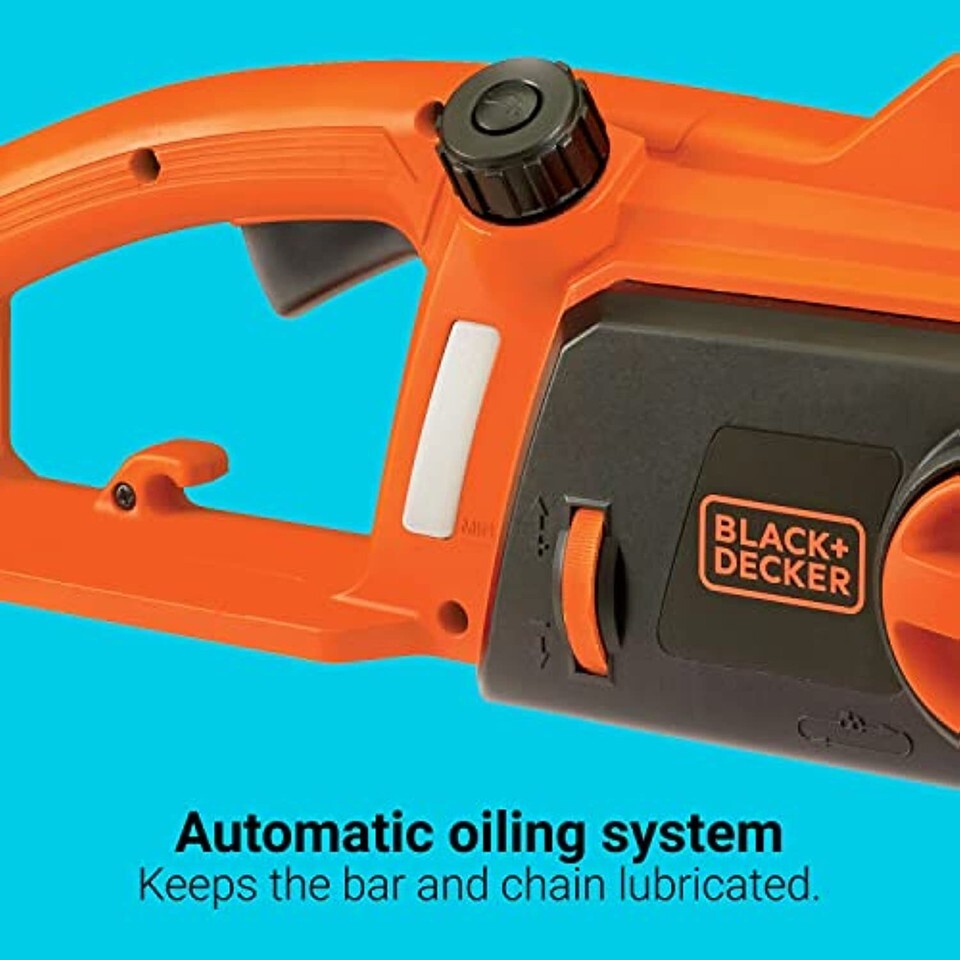 The BLACK+DECKER 16 Amp 12 in. electric chainsaw is equipped with a powerful motor, so you can make quick work of tough branches and logs. Its 16 in. low-kickback bar and chain is designed for smooth operation in different cutting orientations, while the tool-free chain tensioning system allows for fast adjustments without extra tools. Plus, this electric chainsaw?s automatic oiling system and easy-view oil window add extra convenience. And since this chainsaw runs off of electricity, you'll have all the power you need right through to the very last cut.