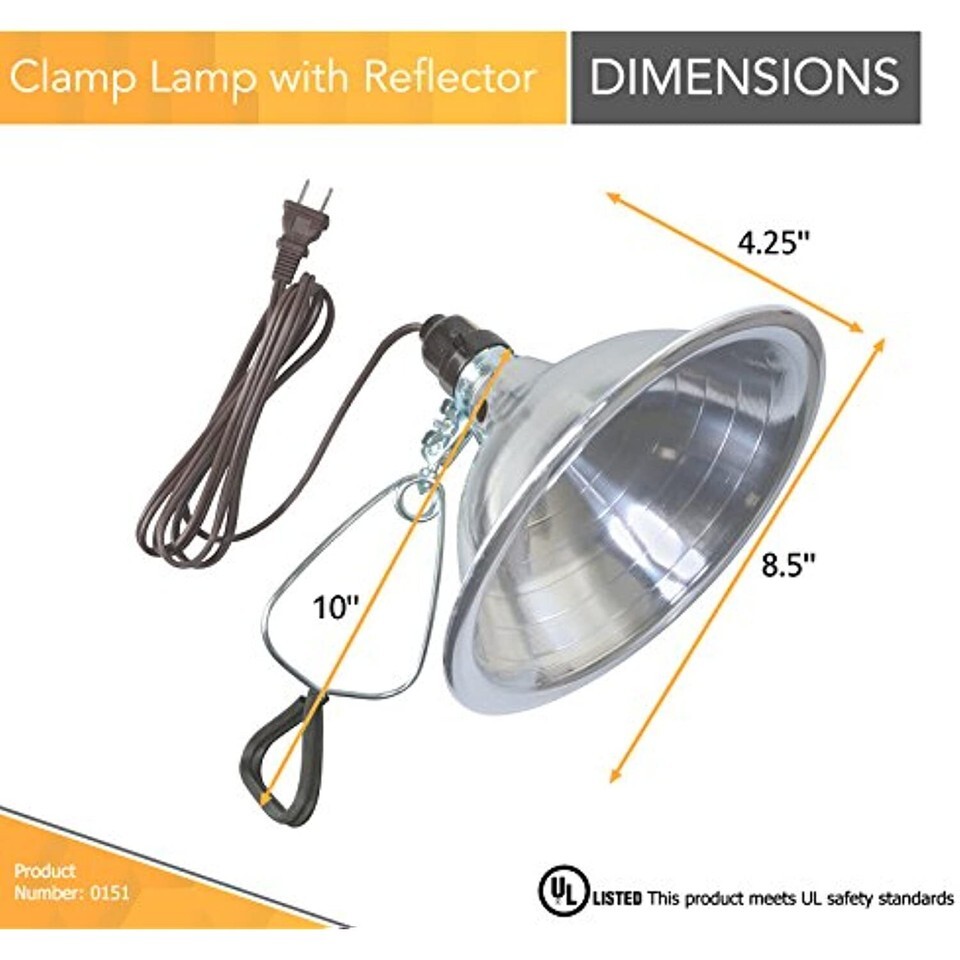 Woods 0151 18/2-Gauge SPT-2 Clamp Lamp with 8.5-Inch Reflector, 150-Watt, 6-Foot Cord. On off push through switch and rugged molded-on plug.This lamp will accept up to a 150-watt Light bulb with a standard Medium Base.Find many uses around your home or office. Provides extra light in workshops, basement, or garage. Versatile multi-use utility lamps with polished and vented aluminum reflectors. Each unit features a double ball universal joint, non-marring grips and a clamp-on bracket. Industry Approvals: UL Listed. The Woods (R) brand is a registered trademark of Coleman Cable Inc.