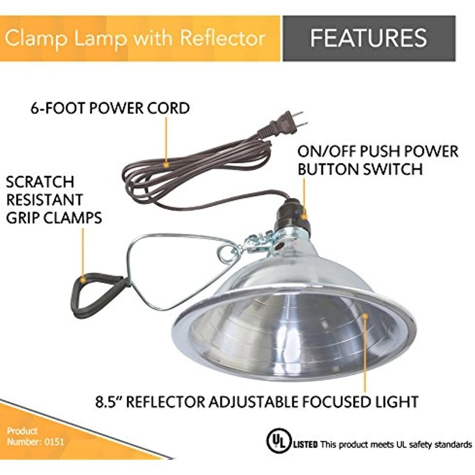 Easy-to-use clamping lamp: with an 8.5? adjustable aluminum reflector for focused light, a convenient on/off button and a 6 ft. long cord for you to mount the metal clamp lamp wherever you like, this clamp Lighting is priceless in places where there are no readily available light sources