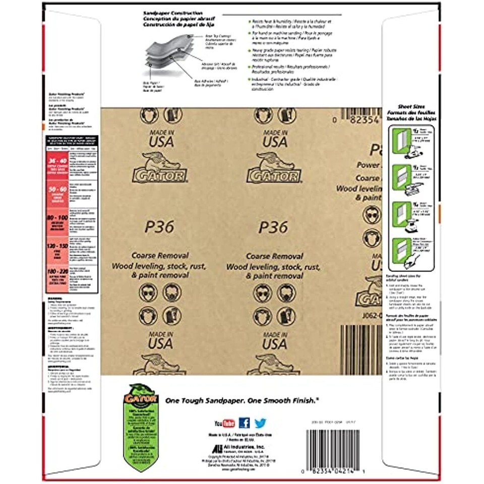 Product Description Multi-purpose aluminum oxide sandpaper provides excellent performance at a value price. These sheets are ideal for both hand and power tool sanding on wood, metal, fiberglass and painted surfaces. Aluminum oxide is a durable grain that is recommended by professionals for general sanding a wide variety of surfaces. From the Manufacturer Gator Grit 25 Count 9" x 11" 36 Grit Extra Coarse Multi-Surface Sandpaper. These multi-surface sandpapers are ideal for use on wood, metal, drywall, fiberglass or painted surfaces. The sheets can be used for hand or machine sanding. They can be cut into 1/2 sheet, 1/3 sheet, or 1/4 sheet to fit orbital sanders.