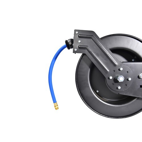 Storing your air hoses doesn?t get much easier or more convenient thanks to the Master Mechanic White Rubber Air Hose Reel with Steel Bracket from Frita Inc. Made with durability and ease of use in mind, this air hose reel with rubber hose features a tough steel construction with a powder coat finish to ensure many years of use. It comes equipped with auto rewind with ratcheting action in order to lock the hose in at the desired length. You can also count on a wall mountable bracket with an adjustable guide arm for quick and easy wall, ceiling or floor mounting. And thanks to the spring located in the middle drum, the air hose reel provides plenty of stability for secure storage. The Master Mechanic White Rubber Air Hose Reel with Steel Bracket from Frita Inc. boasts a PSI of 300 max and includes a 3/8-inch by 50-foot rubber hose that allows you to tackle a wide range of projects. You won?t find a better way to accessorize your garage!