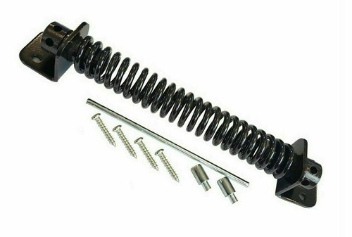 Self closing gate spring is constructed of steel components and comes finished in Black paint. Tension is adjustable.