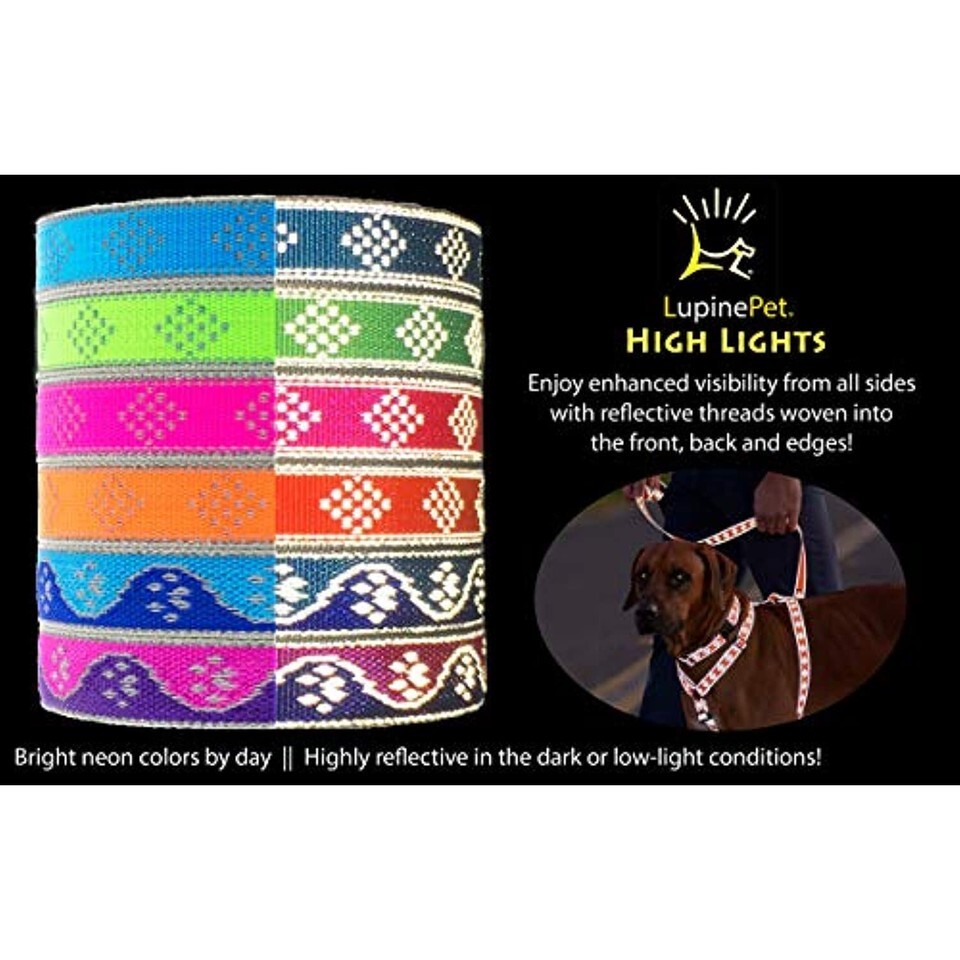 Lupine products are proudly built in Conway, New Hampshire and Guaranteed (Even if Chewed). They are not chew-proof (no fabric is!) but if they get chewed, LupinePet will replace them. Search on ?Lupine Guarantee? to see how EZ it is!Lupine High Lights are available in 6 bright colors and three widths: 1/2", 3/4" and 1". 1/2"-wide harnesses are suitable for small dogs and puppies under 20 pounds. High Lights are made from nylon with reflective threads woven into the front, back and edges for maximum visibility. The reflective threads bounce light back to an observer so that these products may be seen in low-light or dark conditions when light shines on them. Made with strong bar-tack stitching, welded steel hardware, and ends which are turned under and stitched to protect fur and skin. Matching leashes and collars are available.The Lupine Adjustable Step In harness is for small dogs under 20 pounds. In two girth size ranges: 10"-13", or 12"-18". To choose the correct size always measure the dog around the body, just behind the front legs. Measure snugly, and then add an extra 5% to find the actual adjusted size of the harness girth. Or, measure the girth strap from the dog?s current harness.This harness goes on from the feet up. Start by unbuckling the clip, then place each front paw on either side of the center strap. Then bring the two ends up and over the dog?s back and clip the buckle closed. Adjust the three straps as needed.Machine or hand-wash, warm water and mild soap (no bleach or bleach alternative). Air dry completely before use.The harness should be removed from the dog when the leash comes off and it should not be left on an unattended dog. Lupine products are not intended for tie-out.