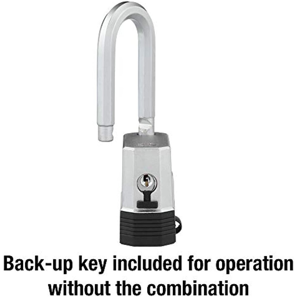 The Master Lock Magnum M176XDLH Solid Body Padlock features a 2in (51mm) wide zinc die-cast body for strength and reliability. The 3/8in (10mm) diameter octagonal shackle is 2in (51mm) long and made of Tough-Cut boron-carbide, 50% harder than hardened steel, offering maximum resistance to cutting and sawing. The roller pin cylinder provides maximum pick and pry resistance. The dial cover offers superior weather protection, and reinforced body bumper protects against scratches. The lock includes set your own combination and the added convenience of a back up key.