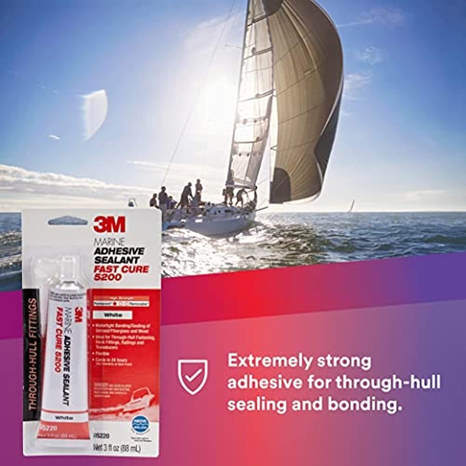 3M Marine Adhesive Sealant 5200 Fast Cure is a one-component, high-strength, moisture-curing, gap-filling polyurethane for permanent bonding of aluminum, wood, gelcoat and fiberglass This fast cure version of 5200 is formulated to typically cure within 48 hours It chemically reacts with moisture to provide strong, flexible bonds above or below the waterline.