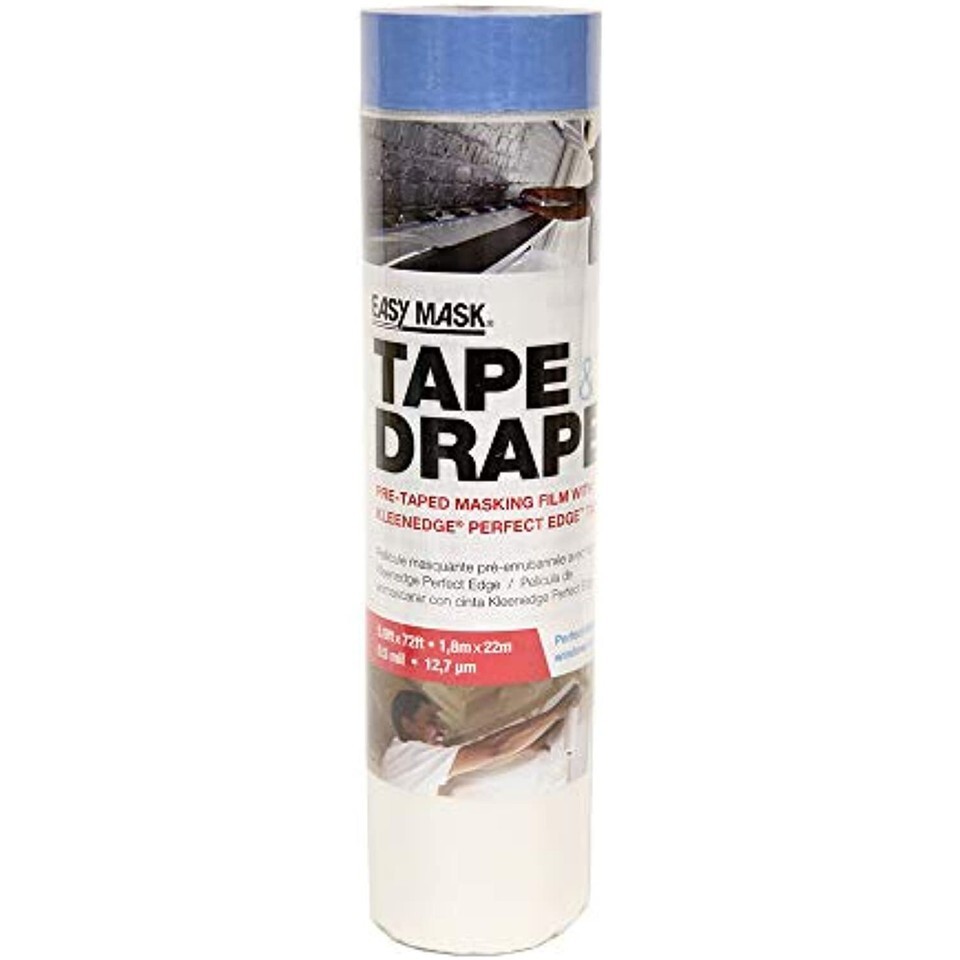 Product Description Trimaco?s Easy MaskTape Drape Pre-taped Masking Film with KleenEdge Perfect Edge Tape is perfect protection for use in areas where you want to catch drips and overspray! Medium tack tape is applied along one edge of high-density 0.5 mil masking film. This film has a unique coating which helps create cling to the surface protected ? even in windy conditions or with spray applicators. Great for painting trim and protecting cabinets during the painting process. Works alone or with Easy Mask?s QM5000 PRO Masker. From the Manufacturer This pre-taped mask film is perfect protection for use in areas where straight lines are needed. Tape is applied along one edge of high-density masking film. Unfolds to cover and protect various surfaces while painting. Measures 5.9-Feet by 75-Feet width by 0.5-mil thickness.