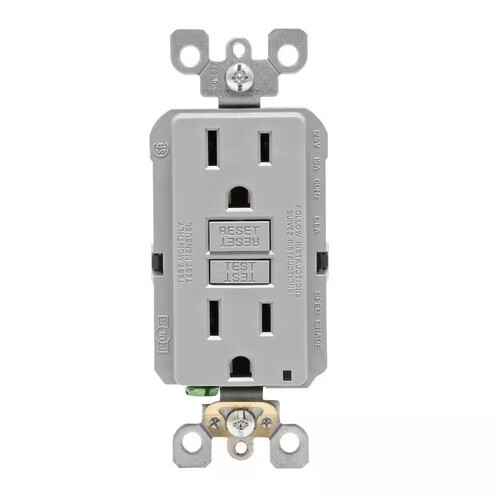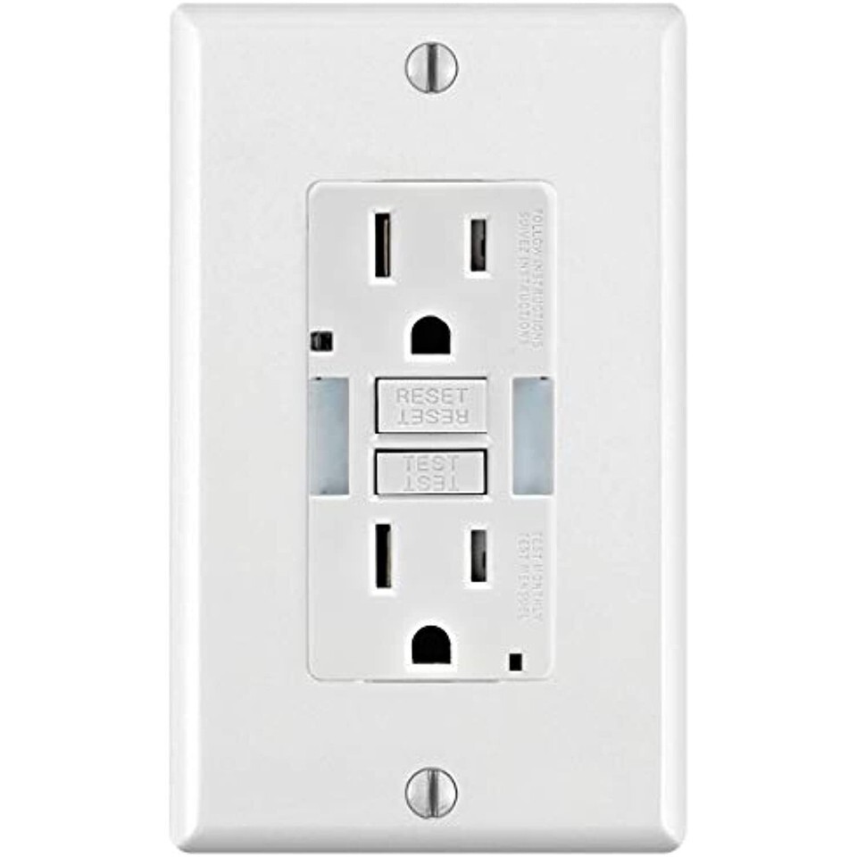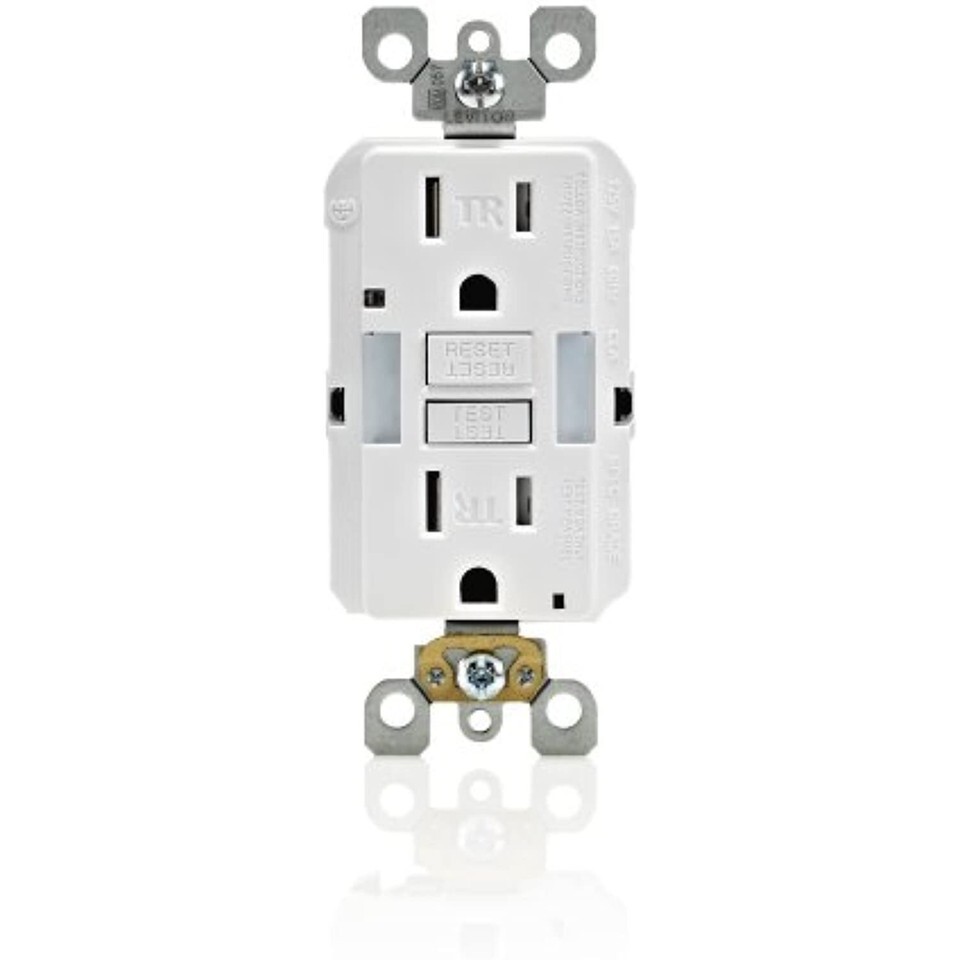 15 Amp, 125 Volt Receptacle/Outlet, 20 Amp Feed-Through, Tamper-Resistant, Self-test SmartlockPro Slim Guide Light GFCI, Monochromatic, back and side wired, self-grounding clip included, Wallplate/faceplate sold separately ? White. The Self-test SmartlockPro Slim GFCI/Guide Light is a great way to add an extra element of safety when it?s dark without losing outlet space in kitchens, bathrooms, laundry rooms and hospitality guest suites. Instead of needing to plug in a night light and take up an outlet space, the device offers dual LED guide lights that turn On and Off automatically based on light levels and uses only 1W of electricity. Designed to meet the latest UL standard for auto-monitoring (self-test) our complete line of self-test GFCIs periodically conduct an automatic internal test to confirm that it can respond to a ground fault. With the slimmest profile on the market, the device allows for fast and easy installation, while Leviton?s patented reset lockout mechanism prevents reset of the GFCI if it is not wired or operating correctly. The self-test SmartlockPro Slim GFCI/Guide Light is the smart choice in ground fault circuit interrupter protection.