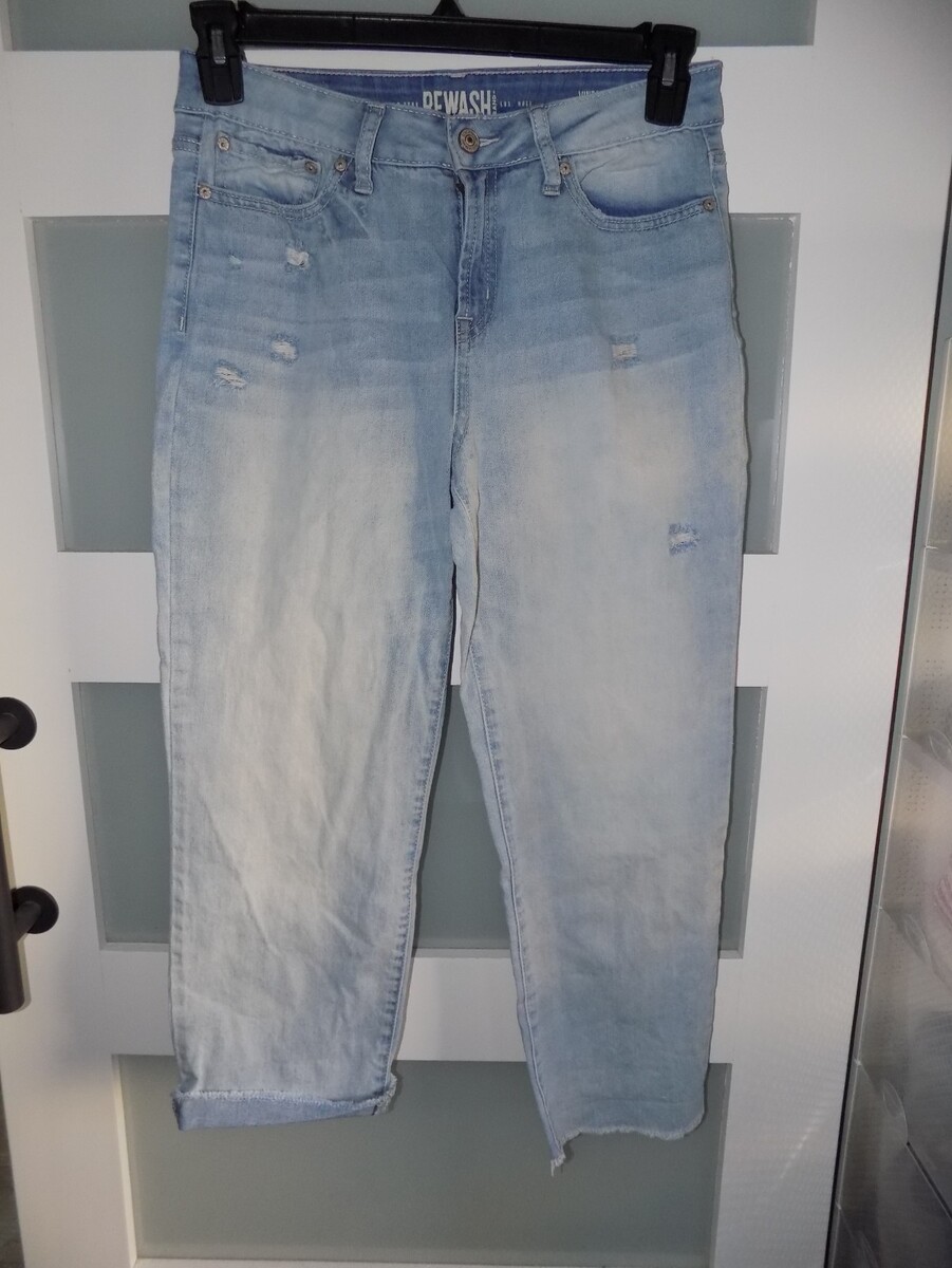 The Rewash Vintage Reunion High Rise Distressed Lightwash Jeans in size 7/28 Junior's are a stylish and trendy choice for young women. These jeans feature a straight leg style, zip and button closure, and a light denim fabric wash. The distressed detailing adds a unique touch to the classic blue color, making them stand out in any wardrobe. Made by the brand Rewash, these jeans are perfect for those looking to make a statement with their fashion choices.