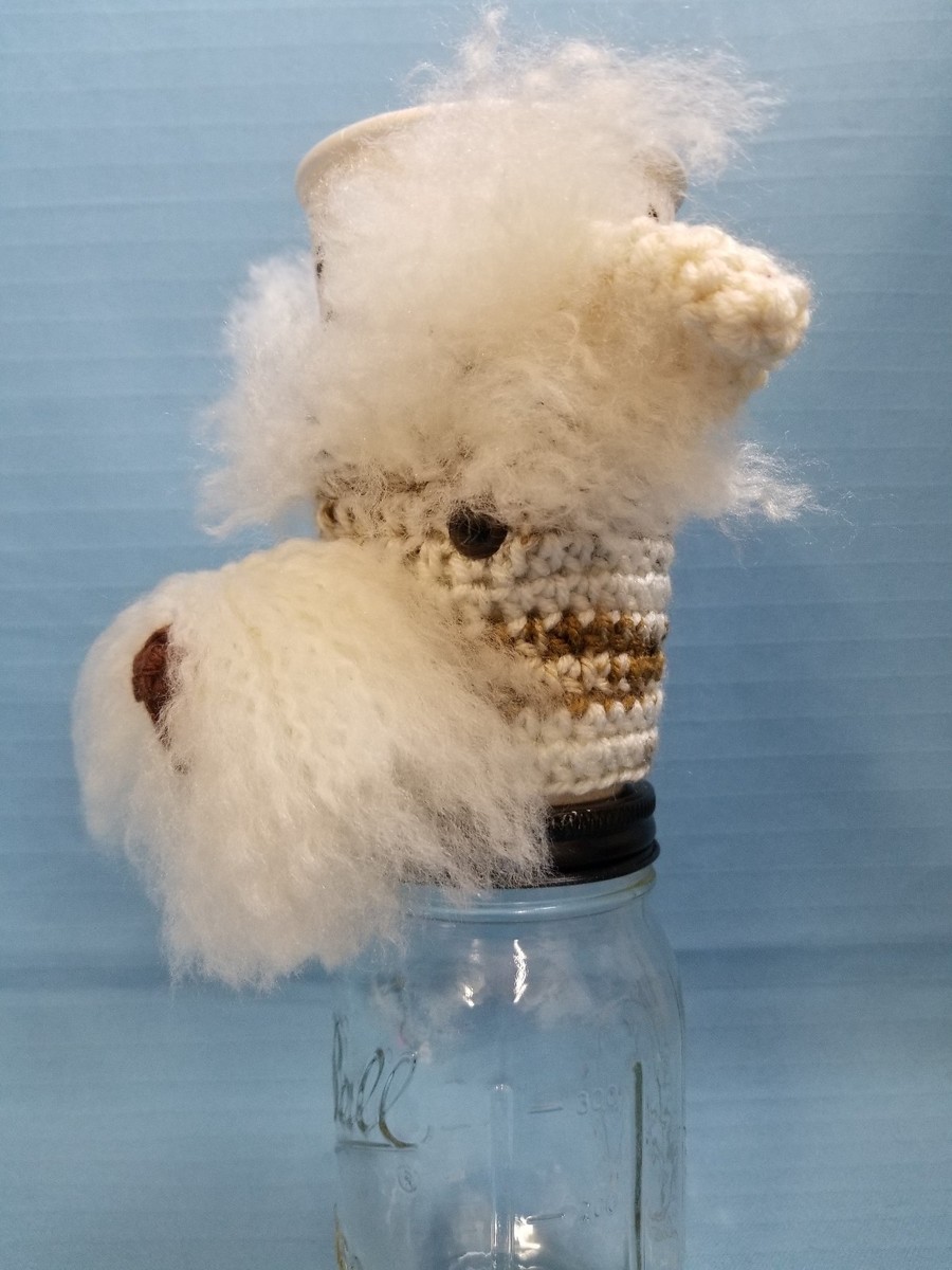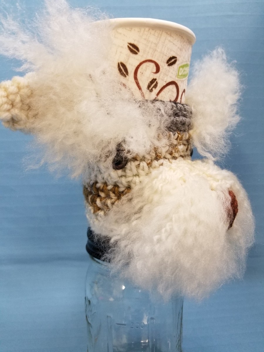 Handmade crochet figurine of a Fox Terrier mix breed puppy dog, serving as a cute cup cozy holder.