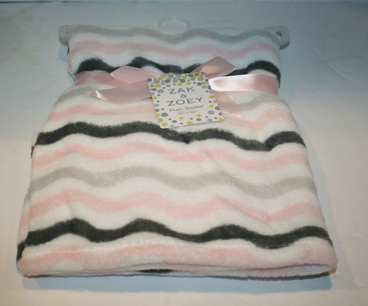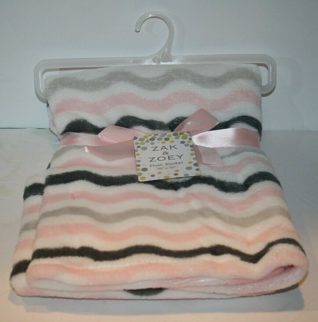 Zak Zoey, Plush, Baby Blanket, Soft, Pink, Gray, White Chevron Stripes, NEW with Tag, SHOWER GIFT, Approx 30" X 30"