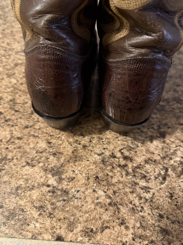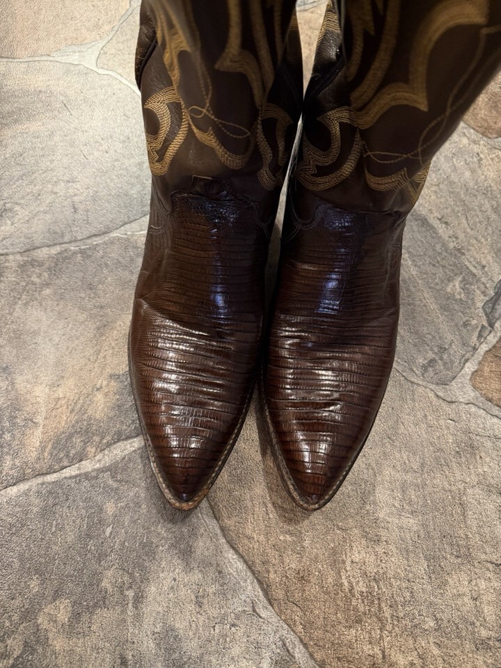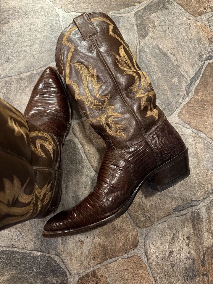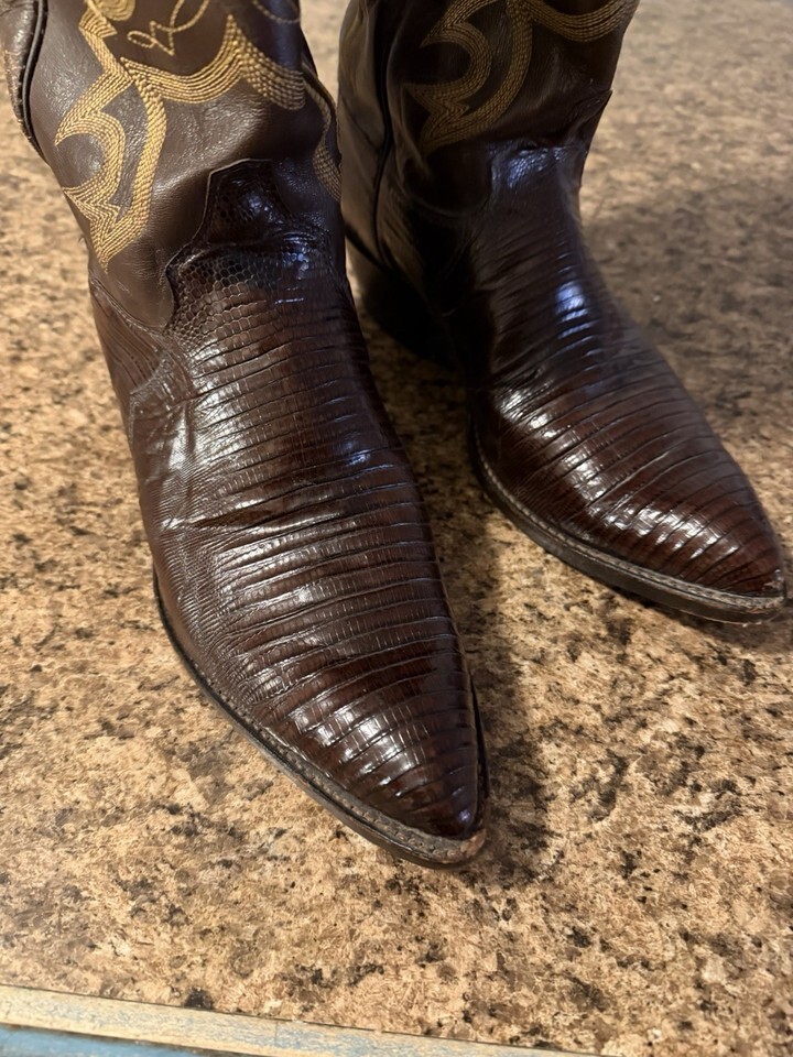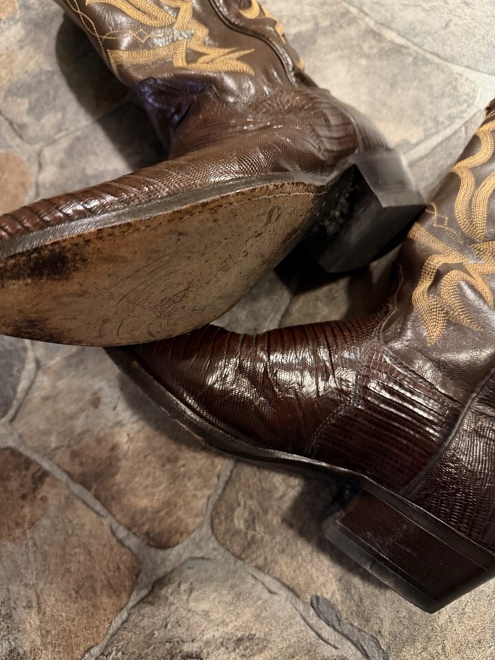 Vintage Justin Mens 8306 Size 9.5D Chocolate Iguana Lizard Cowboy Boots USA MADE. Condition is Pre-owned - Good. Shipped with USPS Ground Advantage.