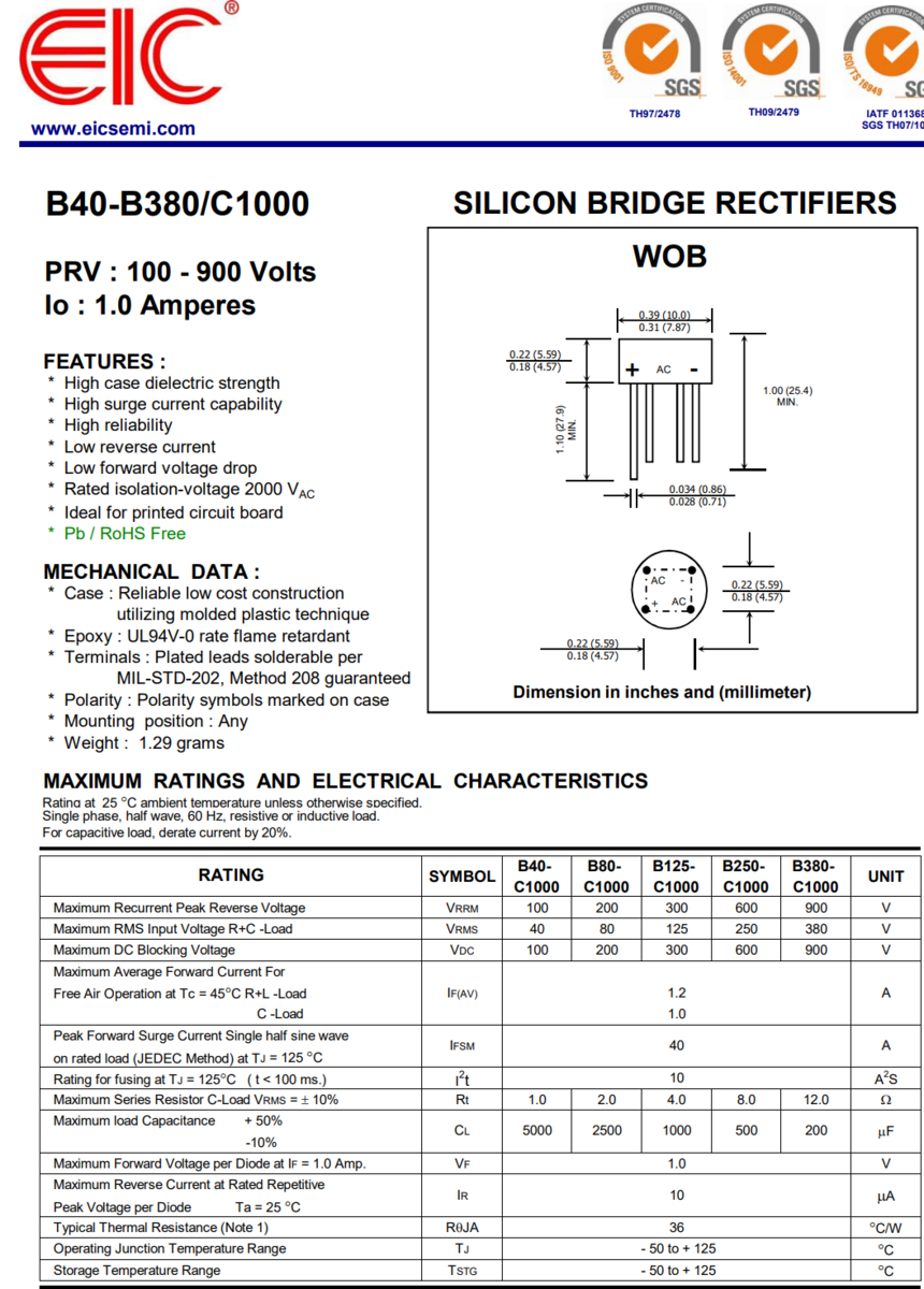 1X B80-C1000 EIC Single Phase Bridge Rectifier 200V 1A WOB-4