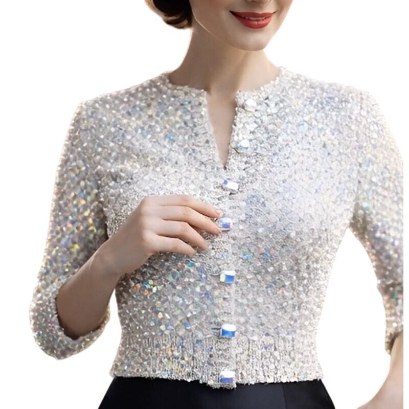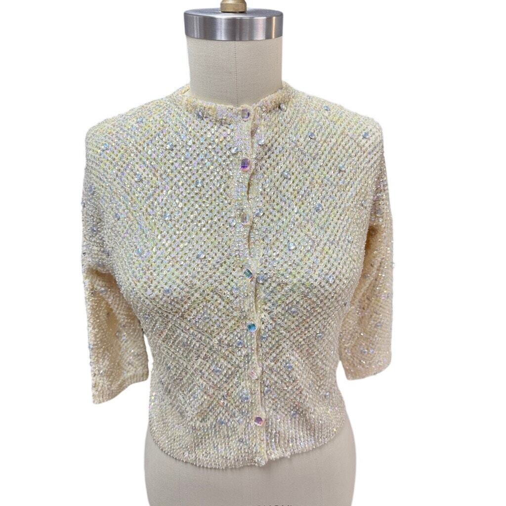 VTG 1950s Laura Aponte Italian Beaded Cardigan Crystal Button Couture Knit