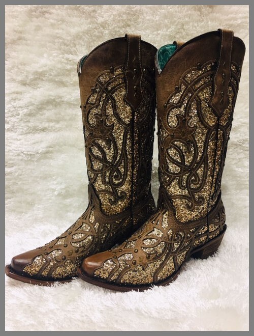 This Ladies Western Corral Boots Style C3331 Glitter Inlay Studs boot is just gorgeous! Brown leather featuring gold glitter inlay and brad studs! No matter how you look at it, it's sparkly and classy! Handcrafted in Mexico. (#1525)