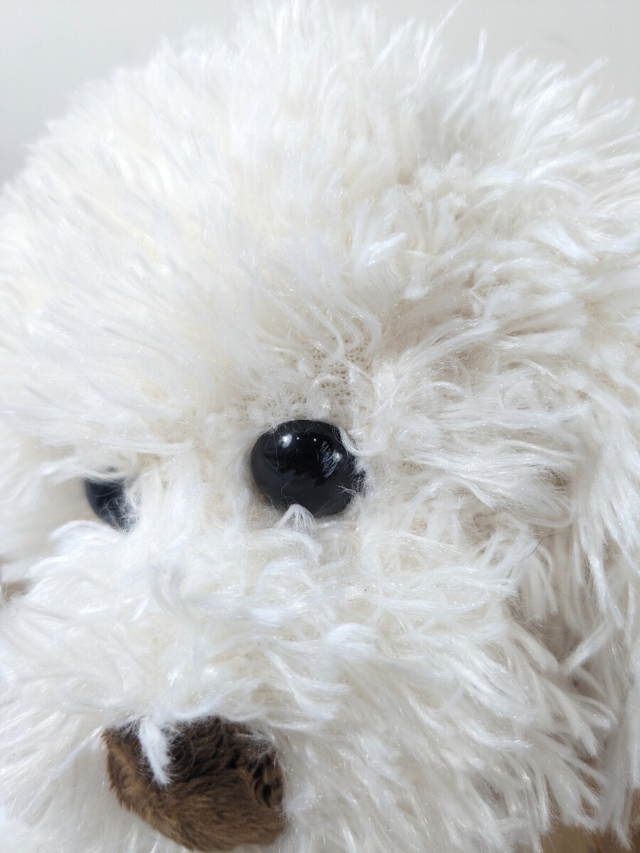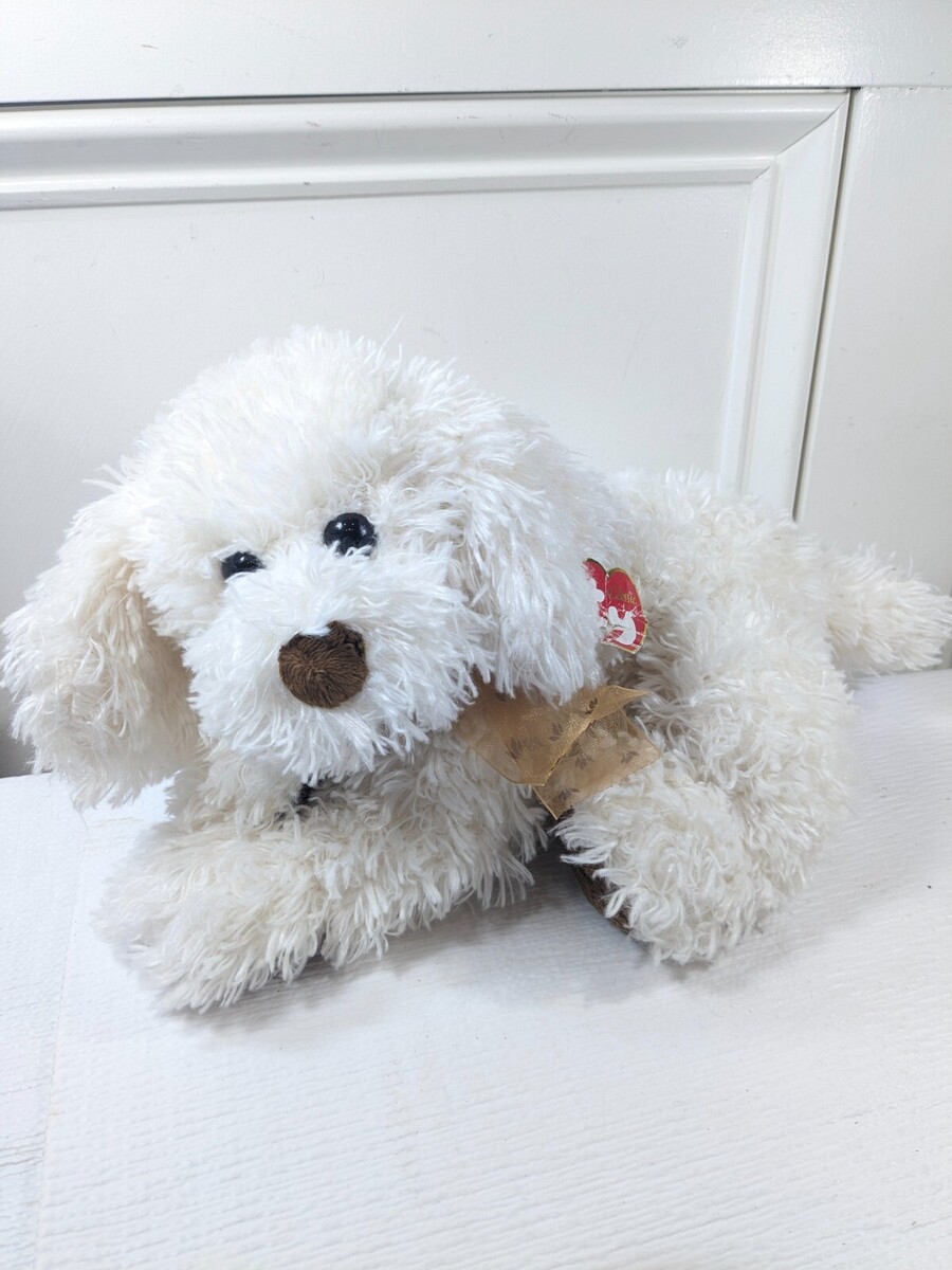 Cream/off white color with brown paws and bow. Tag is worn/torn as shown. Floppy, huggable plush. Small scratch on eye as shown. Otherwise Very good condition.